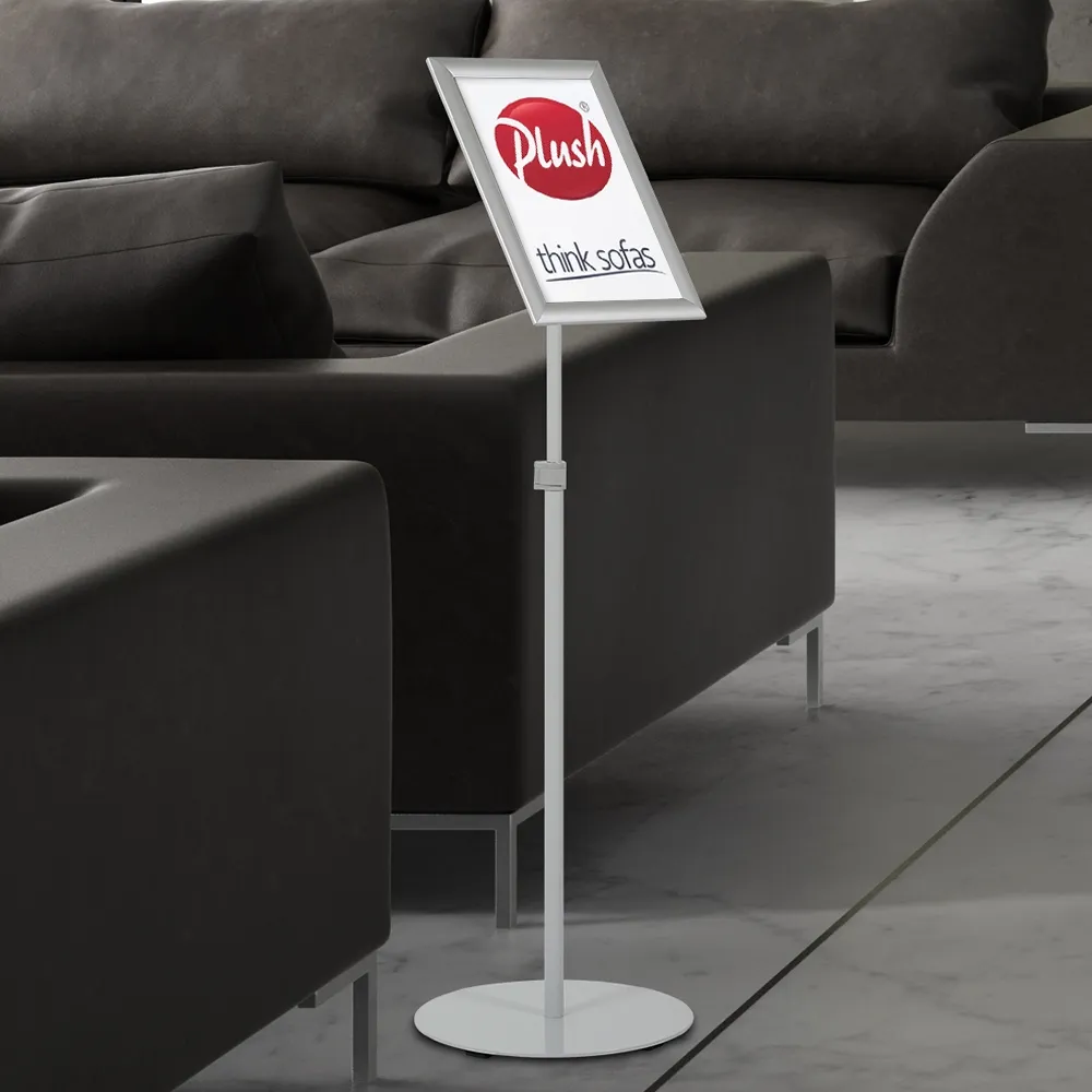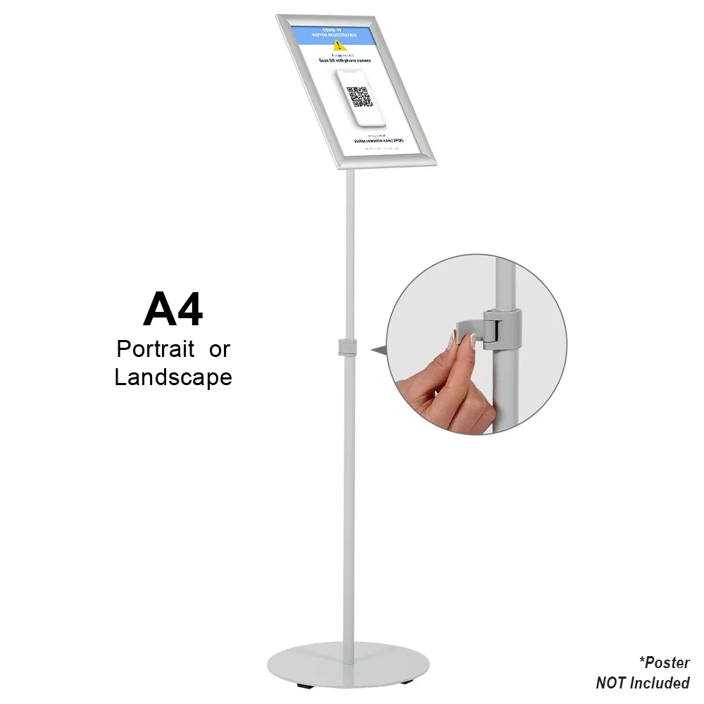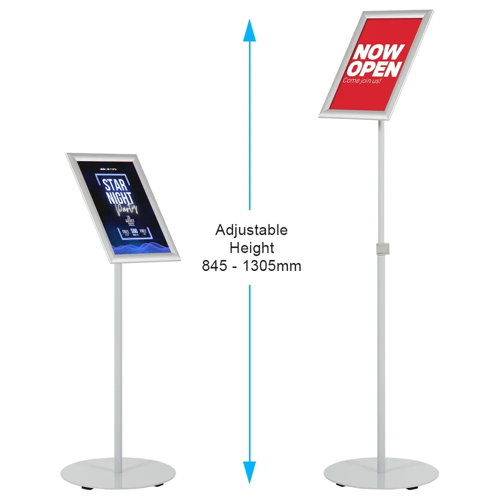 An A4 holder stand makes it easy to provide visitors with information at the proper height for viewing or for placement next to product lines at the right height thanks to the telescoping pole! This menu poster stand can be quickly adjusted between 845 & 1305mm by clip in the middle of the post that tightly secures the pole at the desired height. This style of sign fixture is great for use in hotels, casinos, restaurants, shopping centres, cafes, museums, exhibition halls, and more!