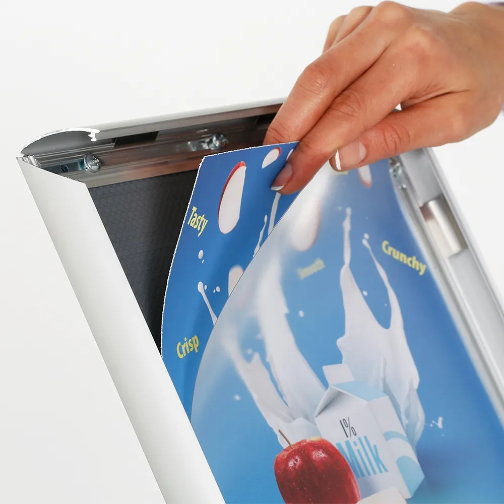 - Snap frame holds A4 (210 x 297mm) graphics in portrait or landscape behind PET lens