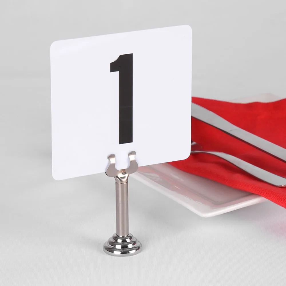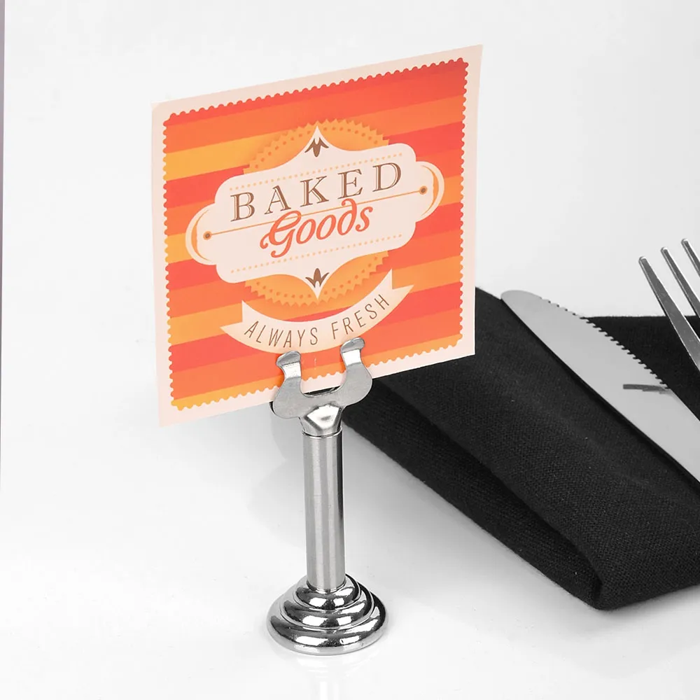 This table number stand is made of stainless steel for durability, with a polished finish for that classic look that works well in different decors. The place card displays have a tiered base that is weighted in order to ensure stability during use. Order today to help guests find their table at wedding or specials events as well as identify different goods in retail stores, bakeries, cafes, buffets, and restaurants!