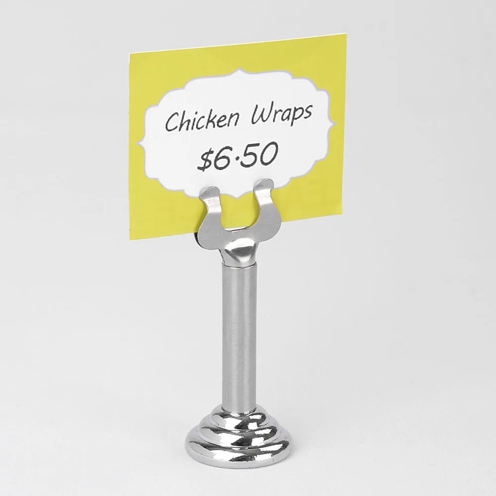 This table number stand, like silver menu holders , hold a placecard or price tag for visitors & customers to see with ease. The display features a small footprint and stands 70mm high to easily be seen during use. The harp style holder is able to hold cards of different thicknesses securely in place. These lightweight displays have a stylish design that works great in formal events and everyday use.