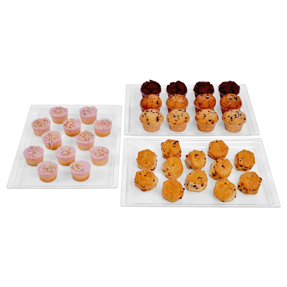 A clear plastic tray, like bakery trays, are made from food grade polycarbonate, perfect for use in restaurants, bistros, cafes, and other food service businesses. There are (3) individual trays included with your purchase, and each one measures 455 x 330mm to hold a variety of baked goods for customers to choose from whilst browsing at your business!
