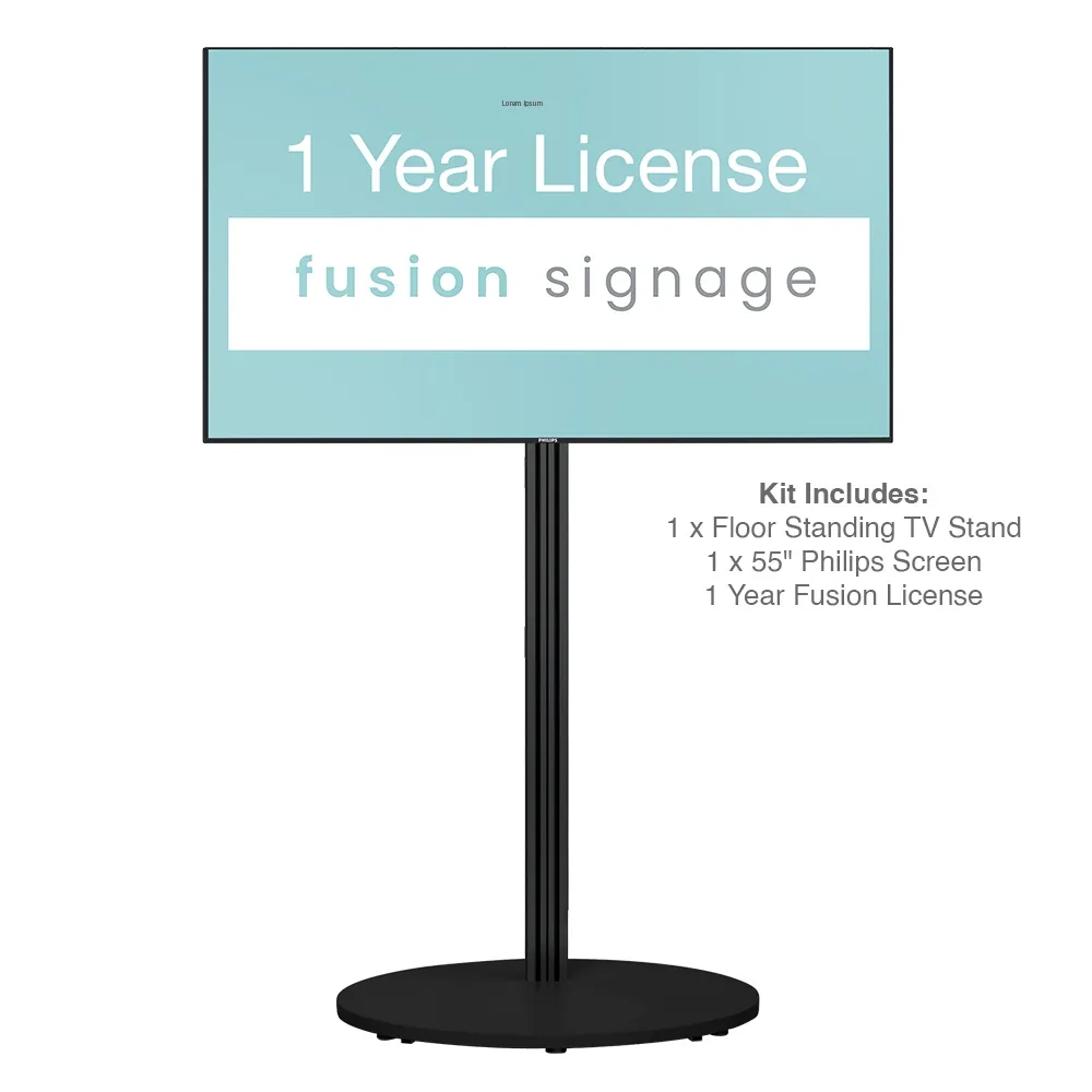 The floor standing digital display also has optional Fusion Signage software to add-on, providing an intuitive content management system that requires almost no training to set-up your presentation in as little as three steps! An advantage of Fusion is cloud based management, making it easy to change content, adjust scheduling, and manage screens from anywhere, no need to even be in the same building! There is one year license included with purchase and 1GB of monthly bandwidth that only counts towards uploading content. Customisation is also possible by working with Fusion for specific needs that your location may require. With heaps of display options and an easy to use interface, Fusion is a great choice for any style of business.Curious about the differences between the software options? Click here for a breakdown!