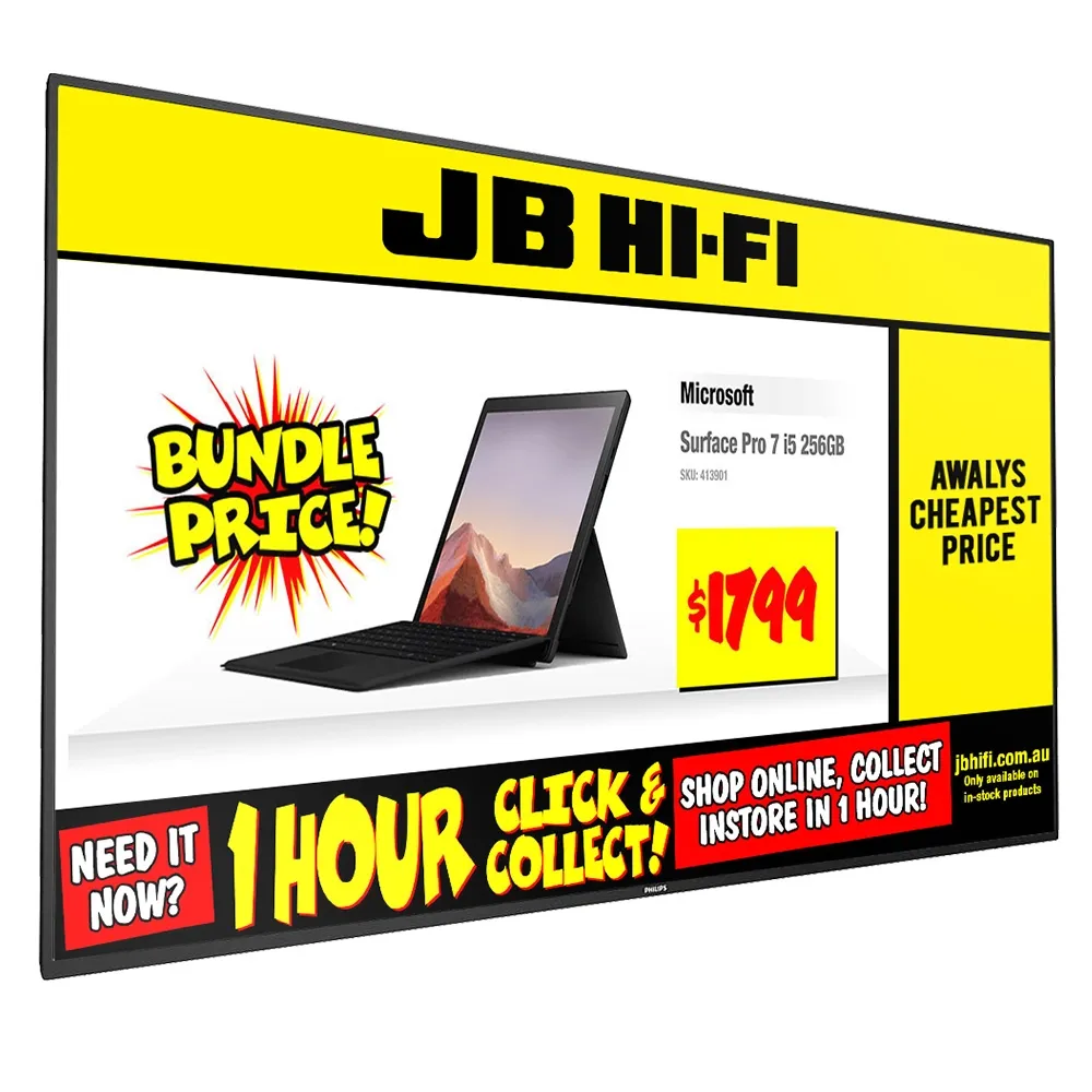 - Floor standing digital display include 55" Philips commercial grade TV w/ 3-year warranty