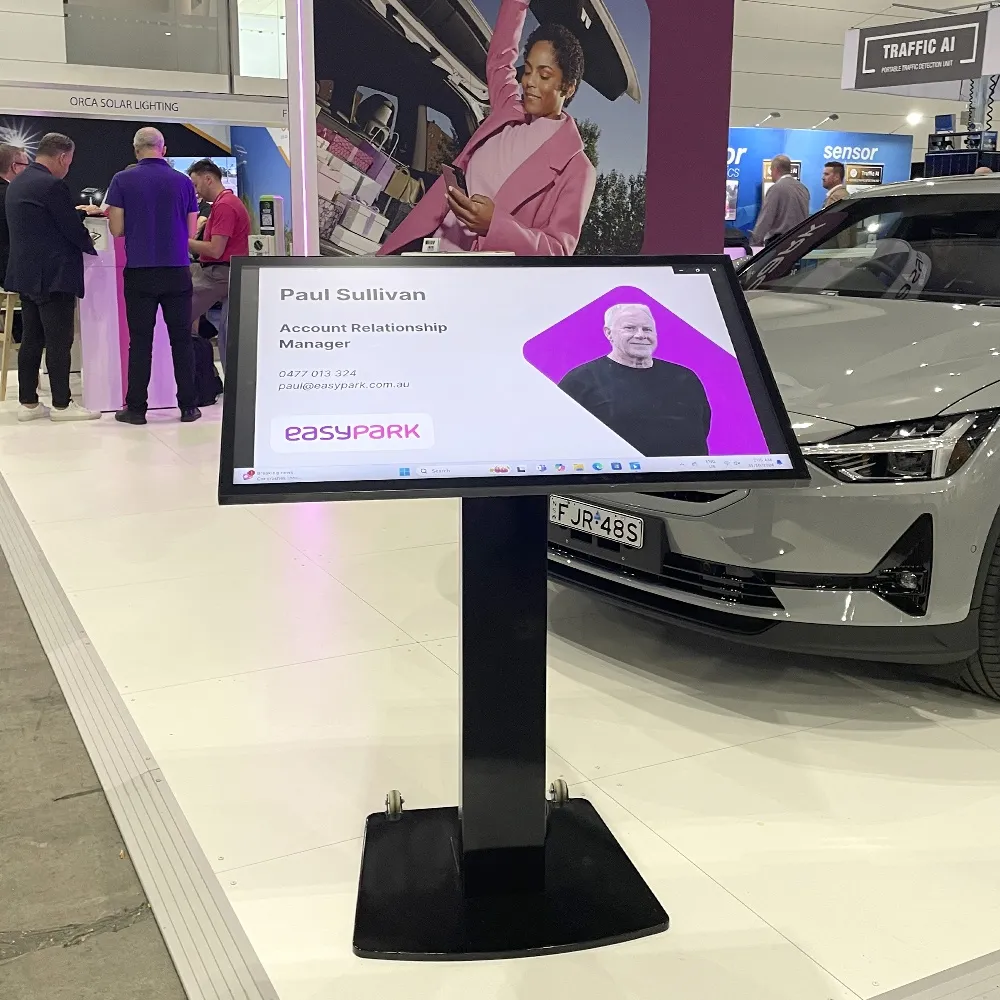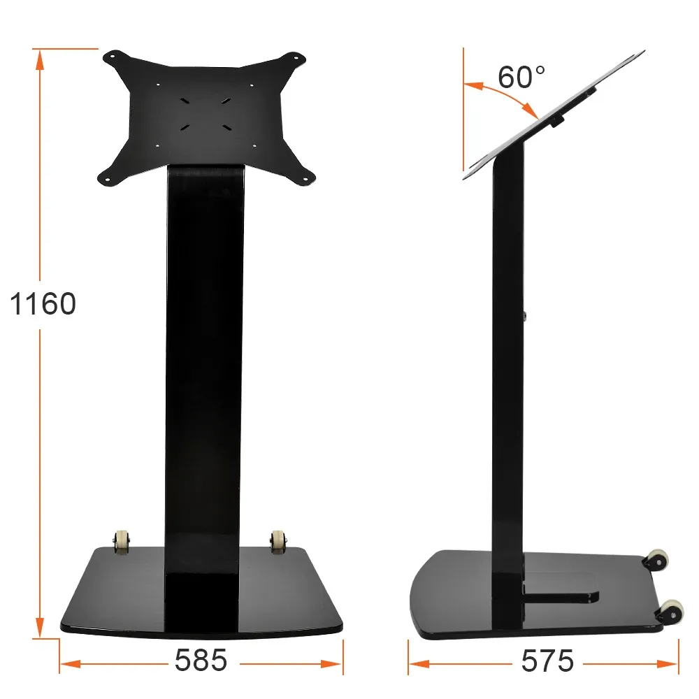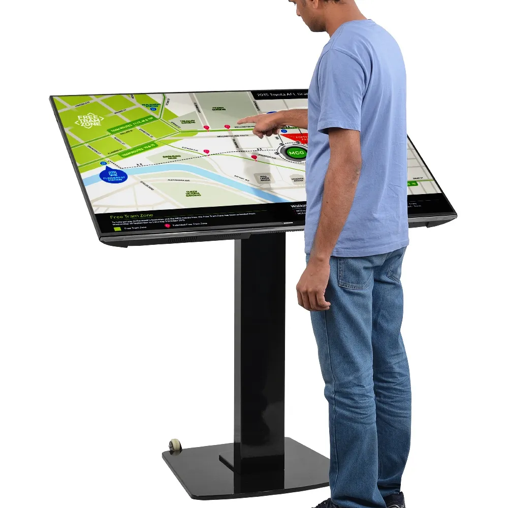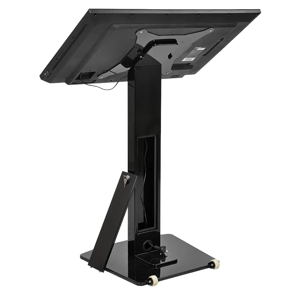 Like mobile TV carts, this touch screen stand features wheels on the base to make positioning it easy. Simply lean the stand back and move it to the desired position! The base is weighted to help ensure stability, with the entire display made of steel and aluminium for use in heavily trafficked areas without worry. The black powder coated finish adds a sleek look that fits in with any décor.