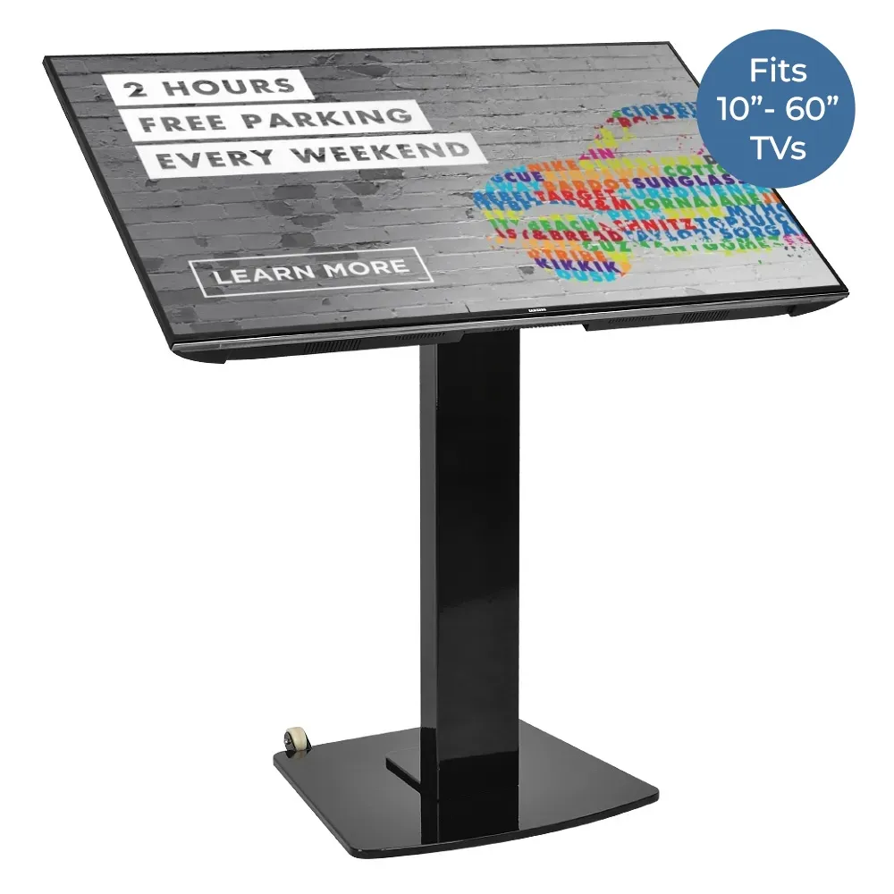 - Touch screen stand holds a 10" through 60" screen to create interactive kiosk