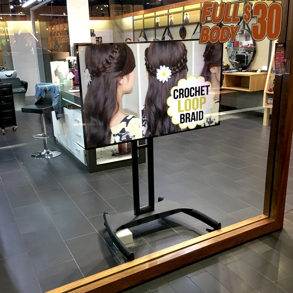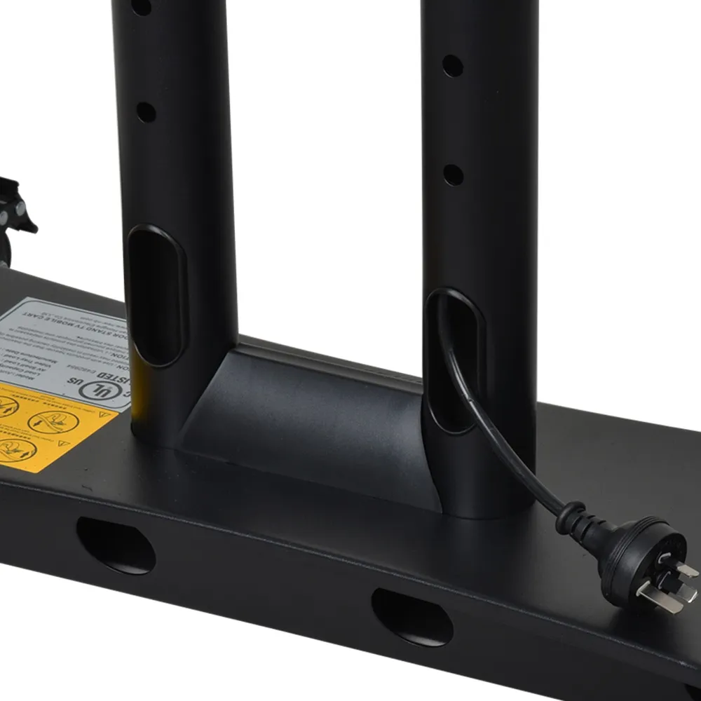The portable TV cart, like many TV stands, utilises wheels on the base to make moving the unit between areas easy for any person. Each wheel can spin 360° for great maneuverability, and can be locked once in desired position to offer a stable display that remains in place. The stand features internal cable management that helps maintain a professional appearance with wires threaded through the centre tubes of the stand instead of hanging down.
