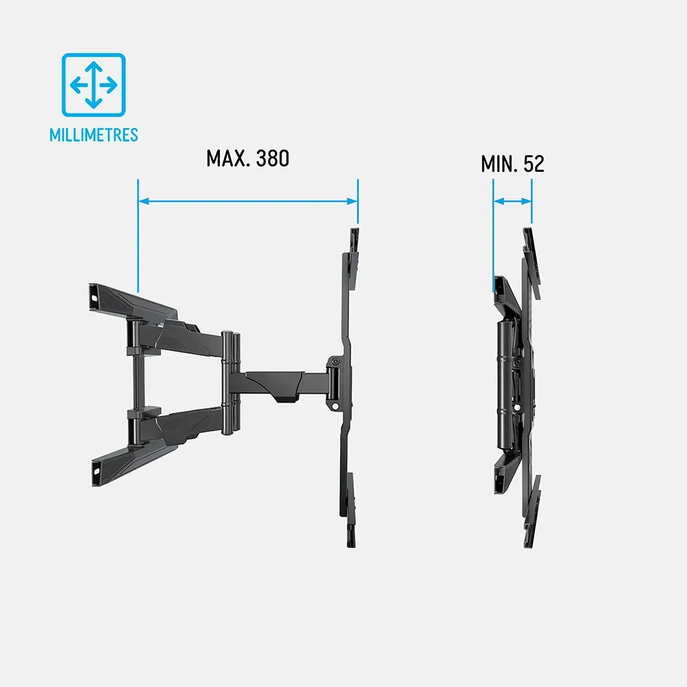 This flat panel mounting bracket, like many of our TV stands, uses a tilting mount to make placing the screen in your desired position easy. You can angle the screen between -5° and 8° to make viewing easy no matter where the screen is placed on a wall! The articulating arms extend out up to 380mm, letting you angle and rotate the screen on the arms to face different directions. The mount is 52mm away from the wall when pushed back flush. Plastic clips along bottom of arms help to guide cables to keep them neatly in place.