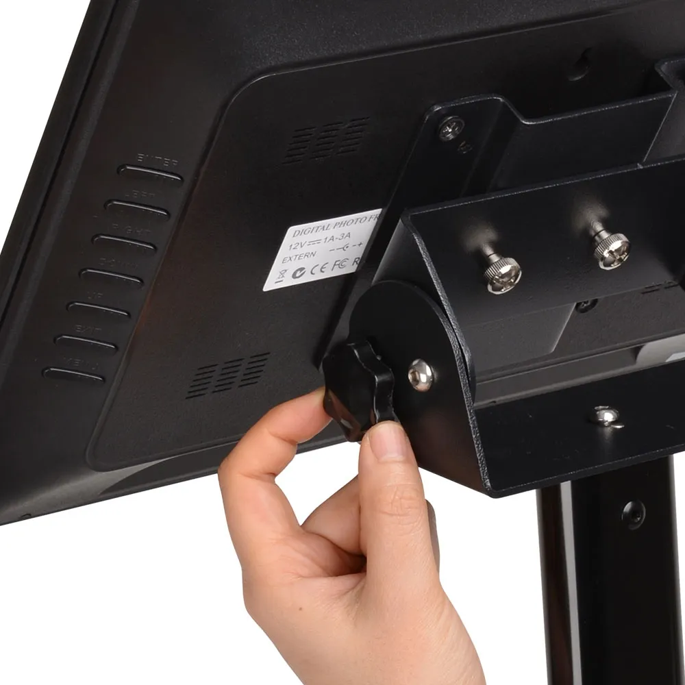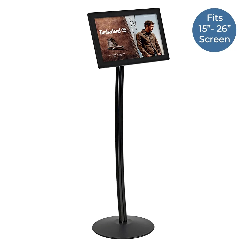 A free standing TV stand is designed to be used at retail stores and restaurants to display touch screens for customers to interact with and learn more about products, menus and services. The LCD floor display holds a 15" - 26" monitor that weighs less than 15kg on the display. The included tilting mounting bracket helps to angle the screen upwards for ease of use, and is VESA compatible for hole patterns 75 x 75mm through 100 x 100mm.