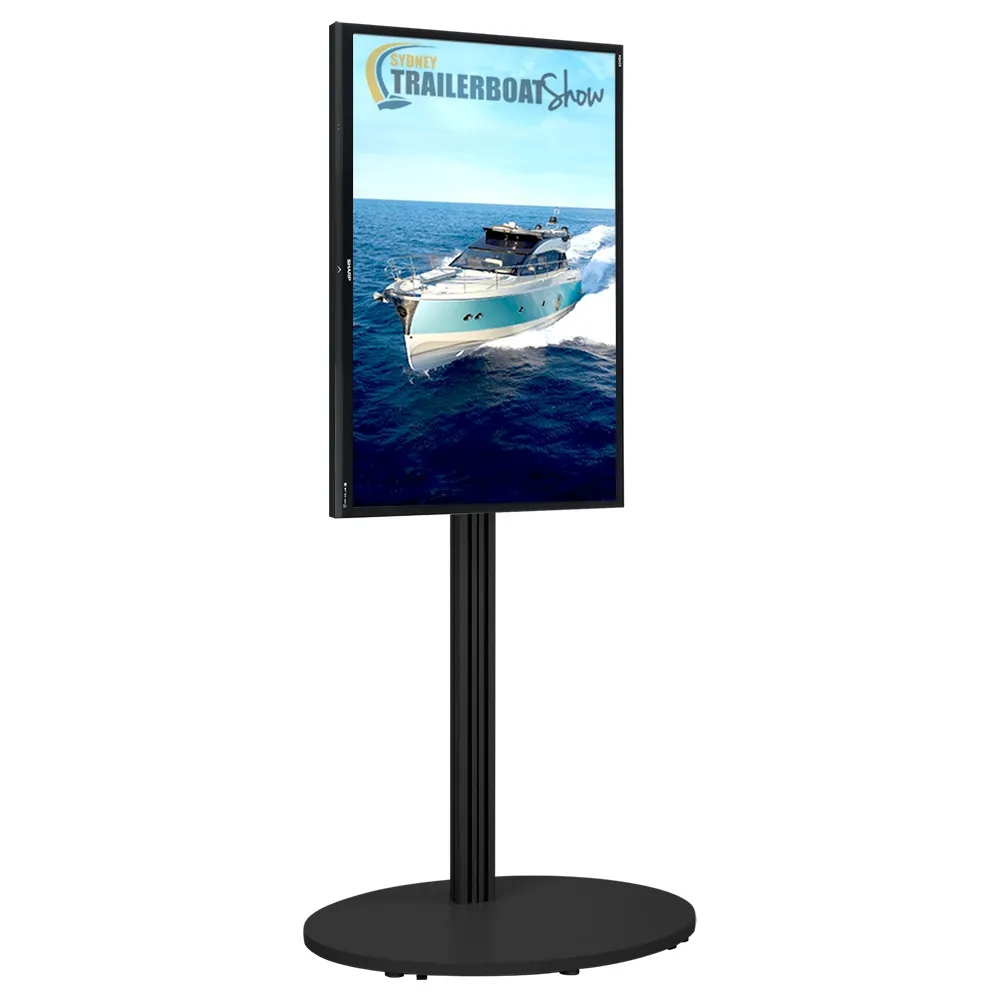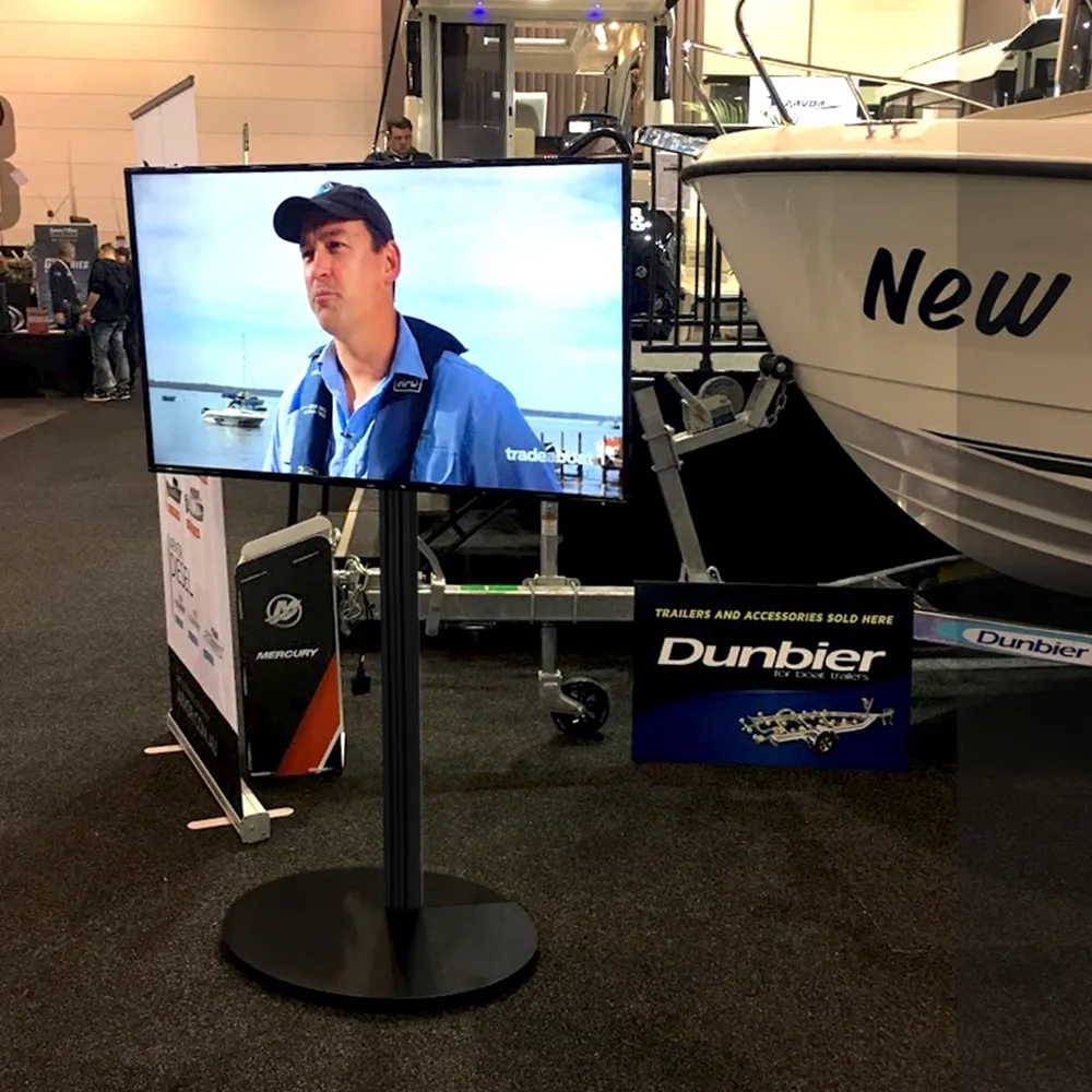 TV stands make advertising at your business easy, as you can create an eye-catching presentation that will get the attention of passersby and inform them of your goods and services. This plasma television display stand is made from aluminium to hold up well in public areas, with a black finish that ensures it will match any décor. This quick set-up display needs only simple tools for fast assembly!