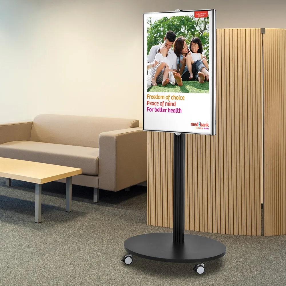 - Base of display has lockable wheels to make moving stand into position simple