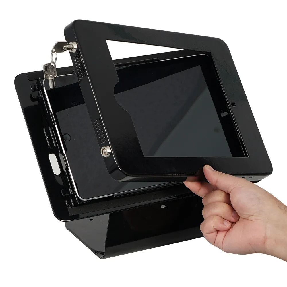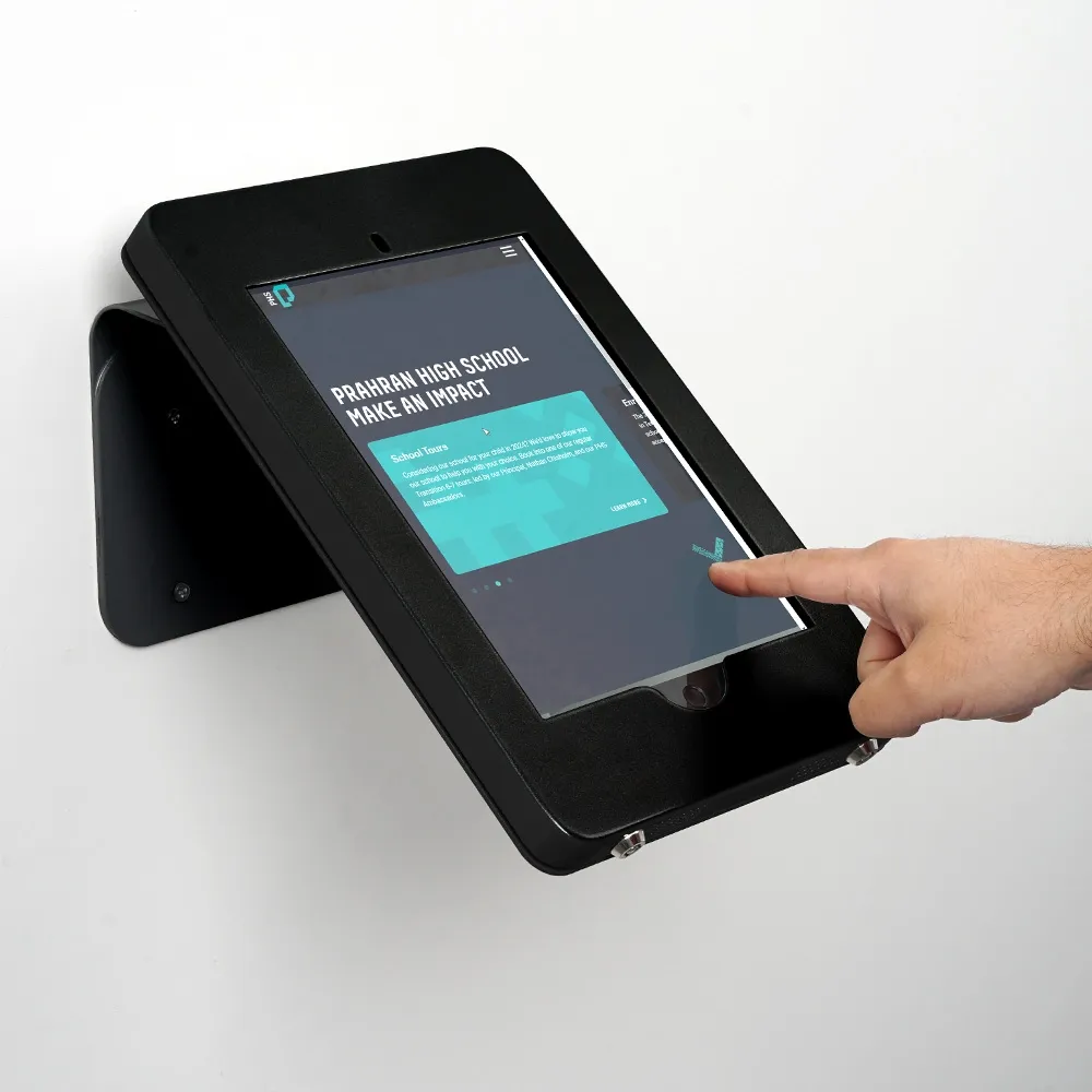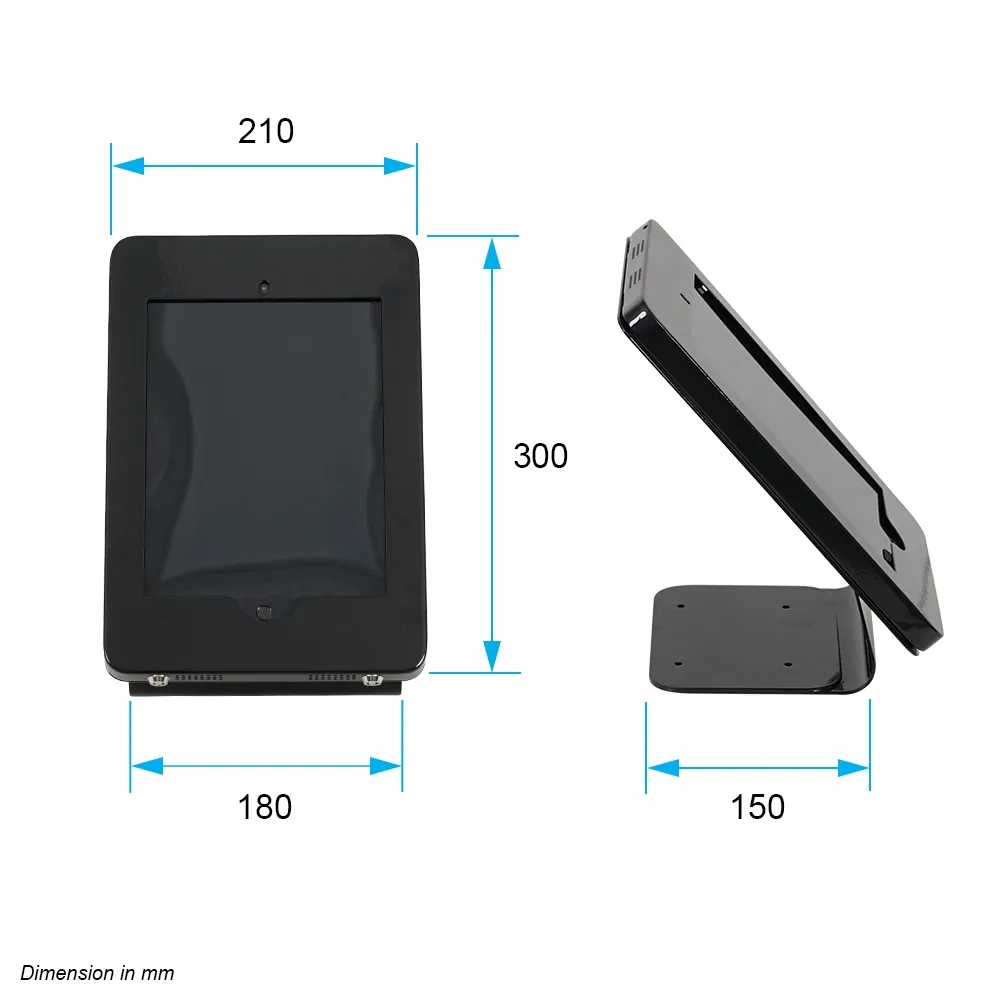 iPad POS holders offer a secure way to have your device displayed in public areas whilst deterring theft. The lockable display has dual lock them one side of the mount in order to help prevent thieves from stealing the device. For as an additional security measure, there is a Kensington lock slot that allows the cable lock (sold separately) to be used. The home button on this model is exposed to allow for additional options whilst using your app. Vents next to each lock promote air flow to help prevent overheating.