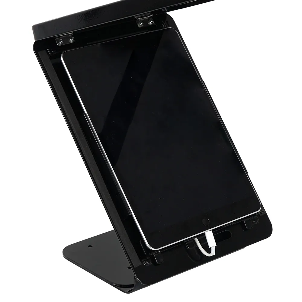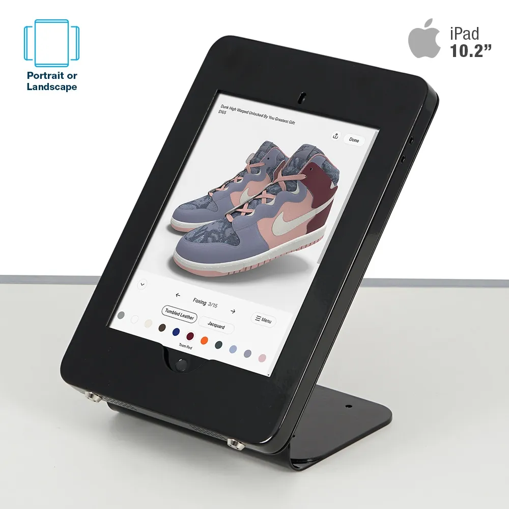 Locking tablet mounts, secure iPad displays, and other iPad POS holders are able to be mounted in landscape orientation on walls and portrait or landscape format on countertops for versatility. This display is designed to hold Apple iPad 10.2”, which includes iPad 2019 (7th generation), 2020 (8th generation), and 2021 (9th generation). The camera is exposed on this model to provide an additional interactivity option at your location. The display is angled no matter where you mount it for a more ergonomic design that is easier for patrons to use.