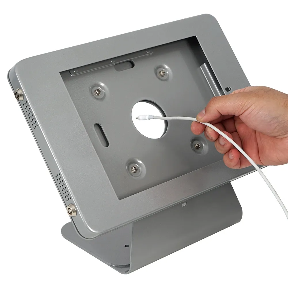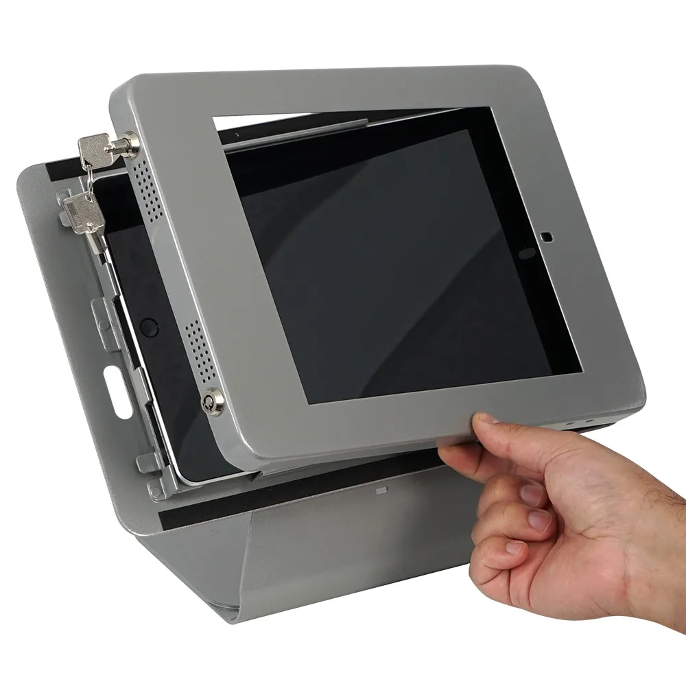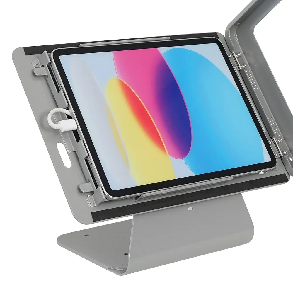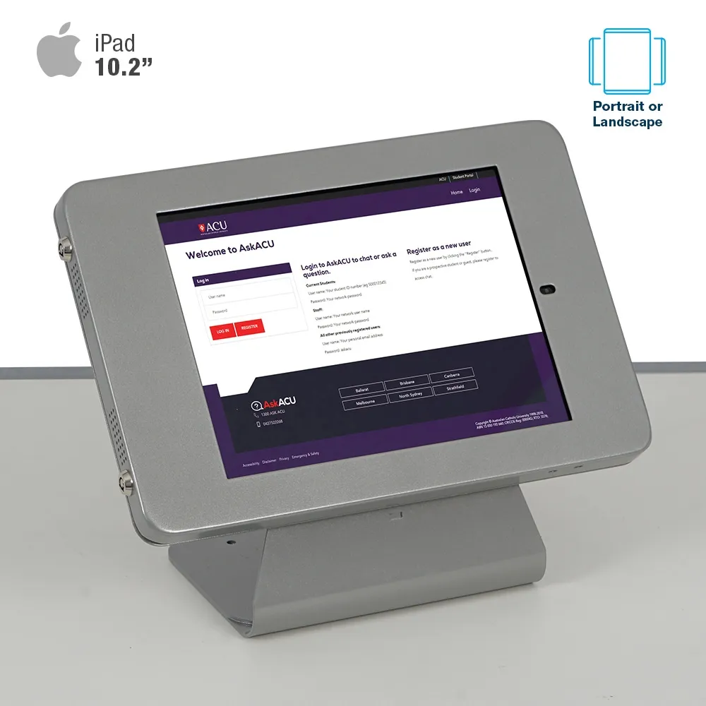 This iPad stand for POS system, like other lockable tablet holders, is a versatile display that could be mounted on either countertops or walls. The tablet display is designed to hold Apple iPad 10.2”, which includes iPad 2019 (7th generation), 2020 (8th generation), and 2021 (9th generation). When mounted on a wall the device can be in landscape orientation only however it can be in portrait or landscape format if placed on a countertop. In either orientation, this screen is an angle in order to be more easily used by visitors to your location. This display has airflow vents next to the locks to help prevent overheating as well as allow speakers to be heard if using audio.