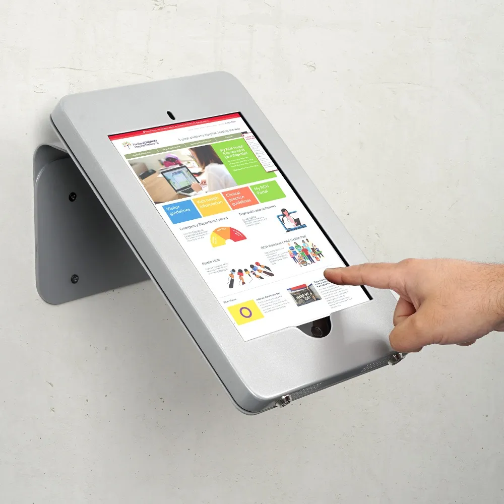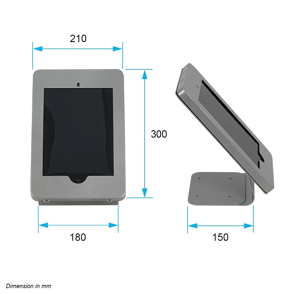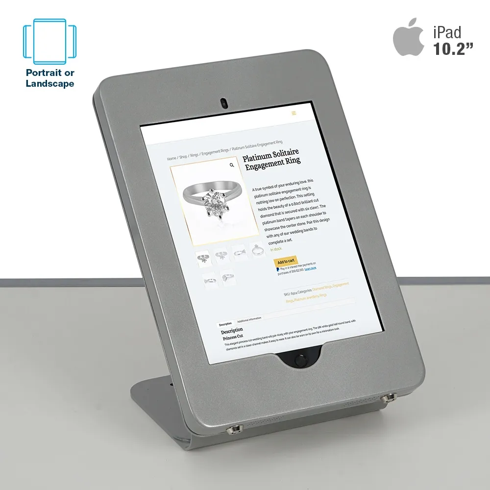 The secure iPad stand for business, part of our line of lockable tablet holders, is a virtual display that is able to be mounted in both portrait and landscape orientation on countertops and solely landscape orientation when used on walls. The display is able to hold Apple iPad 10.2”, which includes iPad 2019 (7th generation), 2020 (8th generation), and 2021 (9th generation). The home button is exposed on this model to allow for additional access to the device for visitors and employees. The camera is usable via a cutout on the mount to allow for additional interactivity.