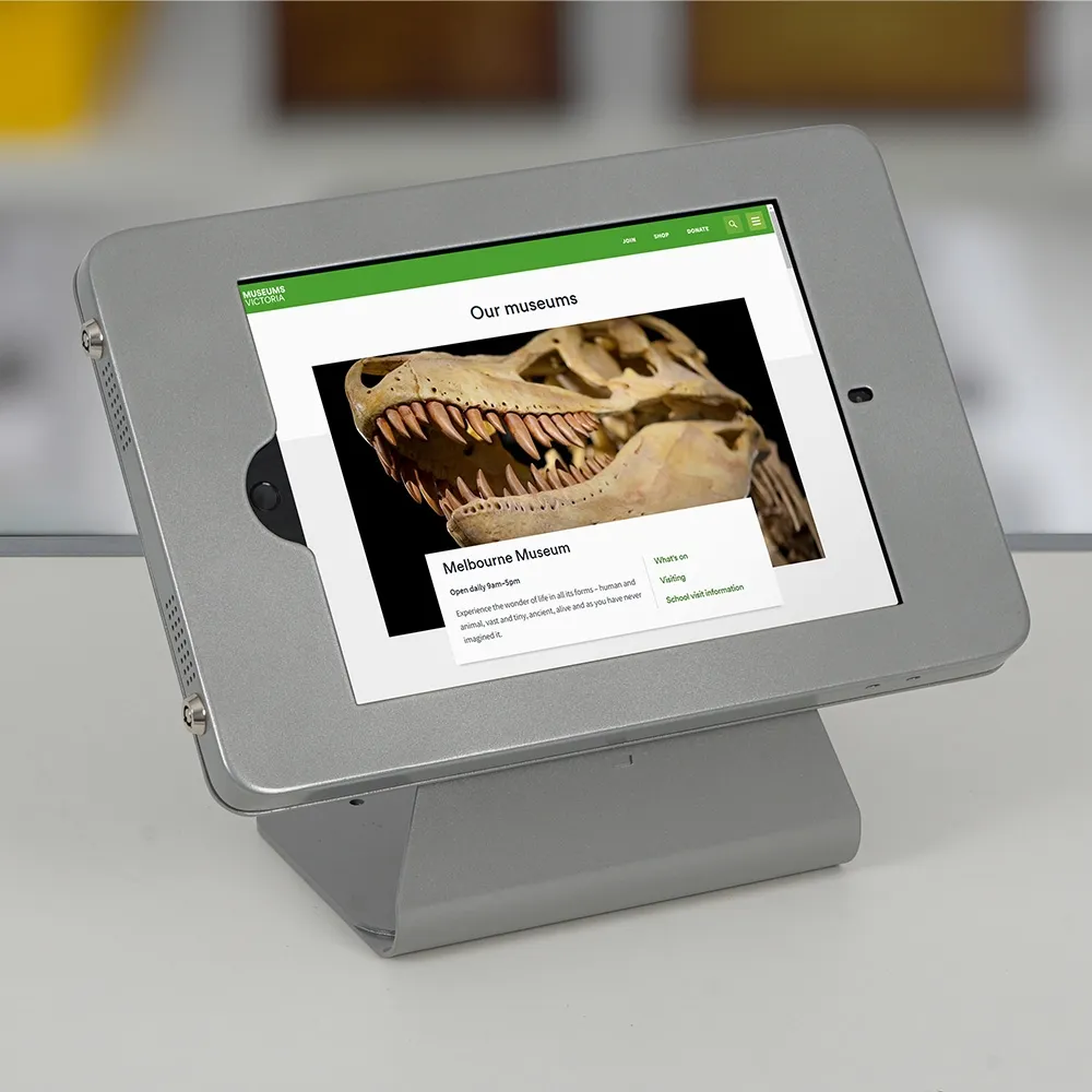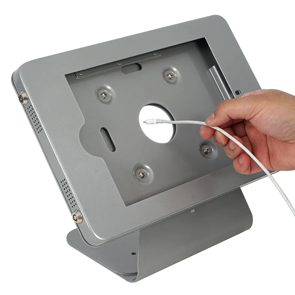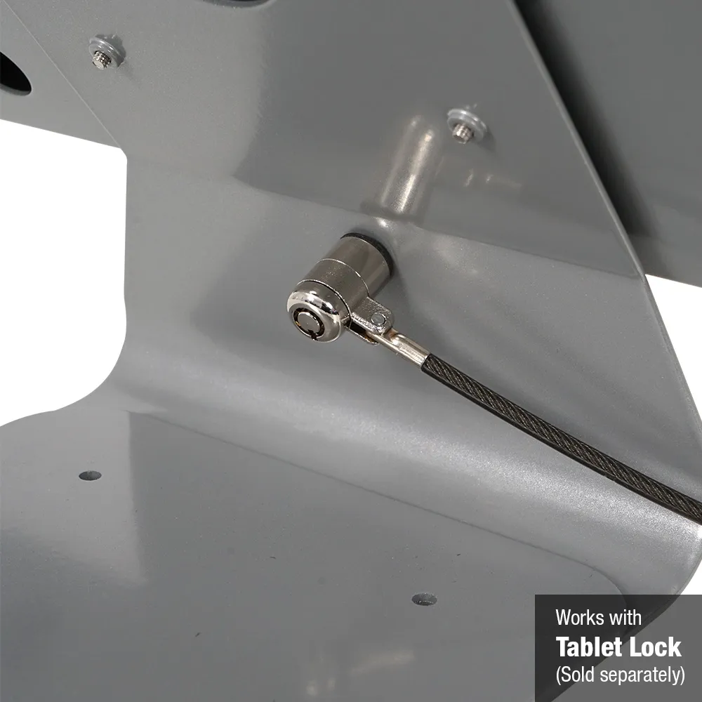 The secure iPad stand for business is a lockable display that is safe for use in public spaces while deterring thieves. There are two locks on one side of the mount that allow employees to access the interior of the unit for changes. For additional security purposes, a Kensington lock slot allows a cable lock (sold separately) to be utilised. There are airflow vents next to the locks to help prevent overheating and allow speakers to be heard.