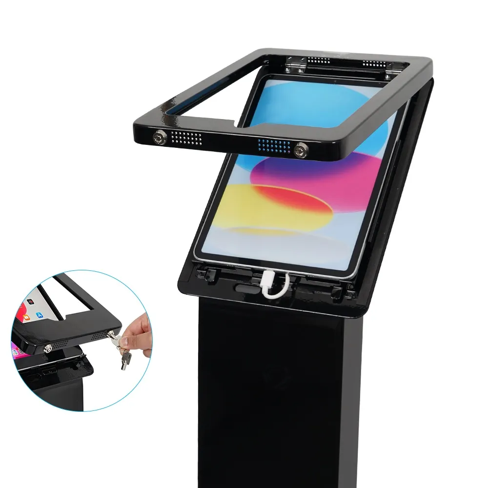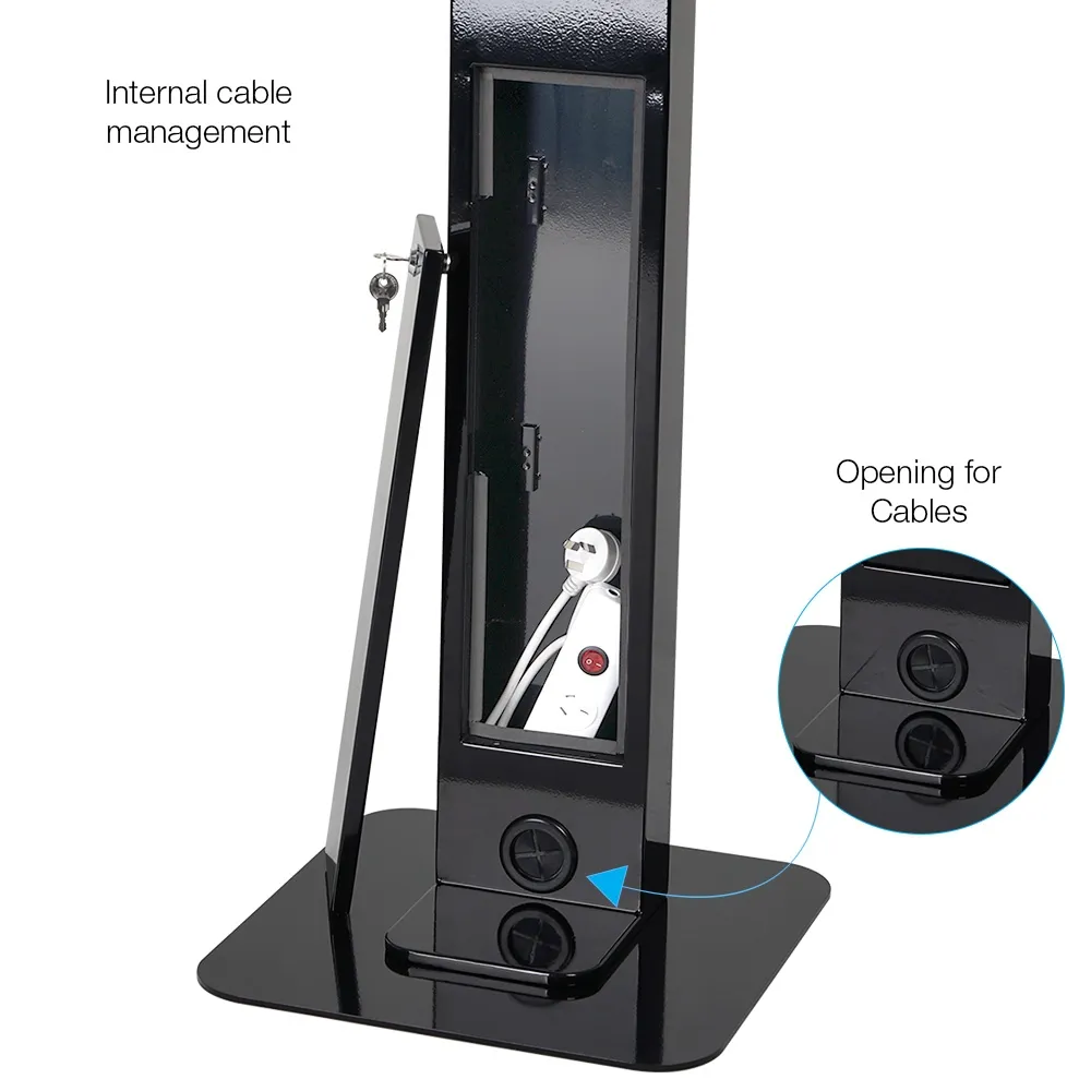 The iPad floor stand kiosk, like other lockable tablet displays, features a secure dual lock design to help prevent theft and allow for use in public areas. There are perforated air holes on two sides of the mount to allow for both airflow ventilation and allow the speakers to be heard. The centre column of the display features a lockable back cabinet, offering an internal space for storage right within the unit. This stand also utilises internal cable management to maintain a tidy appearance, with the power cord threaded through the centre of the stand and out a hole in the back via rubber gasket.