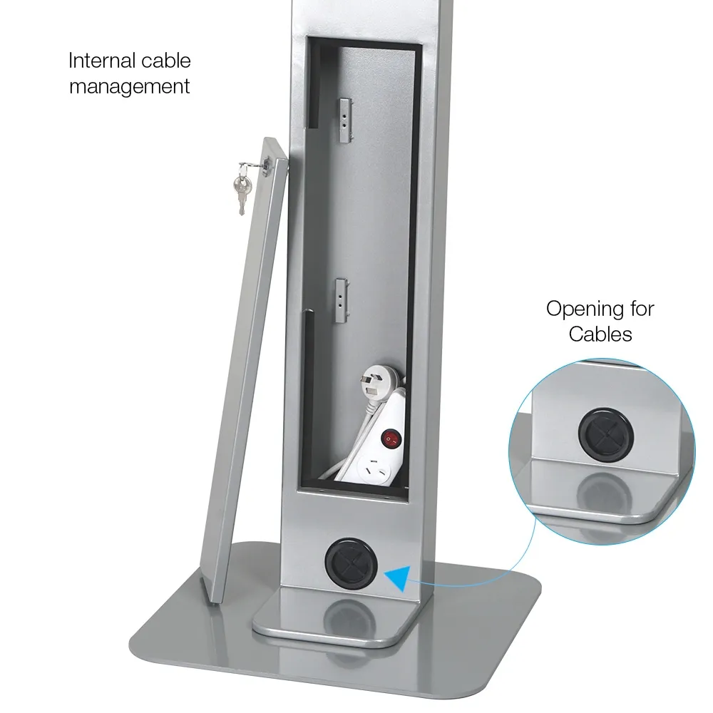 This iPad floor kiosk, like other freestanding tablet holders, is 1375mm tall to be easily accessible for people of different heights. The mount is tilted to provide an easy to use angle for patrons as well. This display is a secure stand, using a locking mount to prevent theft whilst used in public spaces. There are four perforated sections on two sides of the holder to allow for air flow and for speakers to be heard. The rear of the display has a locking cabinet to allow for storage of small items within the freestanding unit. This display offers internal cable management, with the power cord for your tablet threading through the centre column and out through a hole on the rear back to maintain a tidy look.