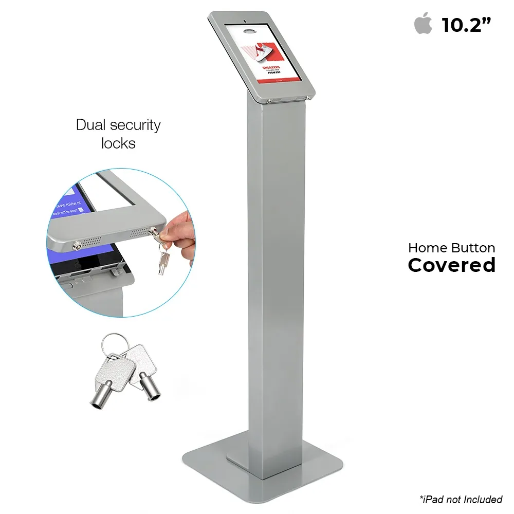Use this iPad floor kiosk to create an interactive display at retail stores, car dealerships, restaurants, shopping centres, information centres, and more. This freestanding display is designed to hold Apple iPad 10.2”, which includes iPad 2019 (7th generation), 2020 (8th generation), and 2021 (9th generation). The mount keeps the home button and the camera exposed to provide additional interactivity for customers, depending on your needs. The versatile mount can be placed in either portrait or landscape orientation depending on what works best for the app that you are.