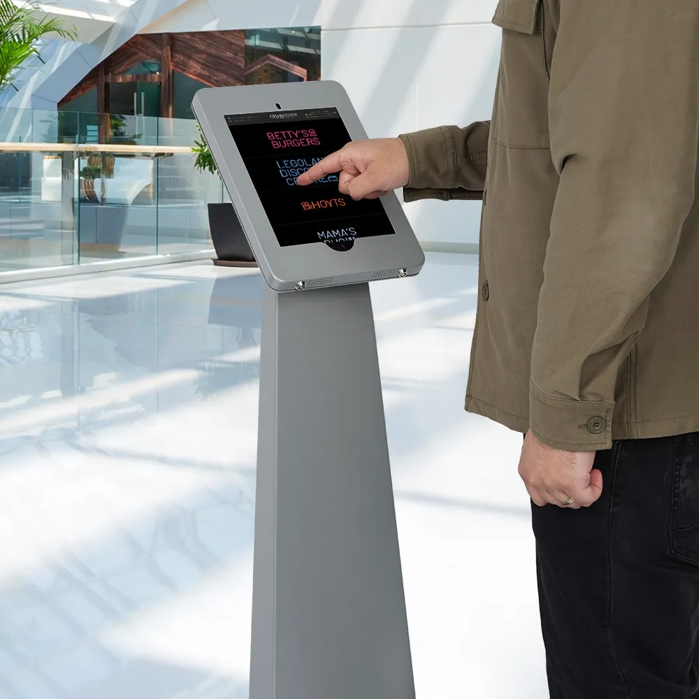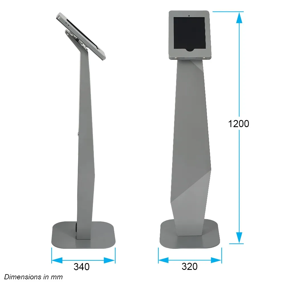 This iPad stand 10.2 inch, like other freestanding tablet displays, features a locking design to allow use in public areas. The interior of the stand offers 180 x 570 x 60mm storage space that is accessible via a locking panel on the rear. This floor standing display utilises internal cable management to maintain a professional appearance, with the power cord for the device remaining inside the center column and coming out of a hole towards the base on the back. At 1200mm tall, this stand is perfect for users of different heights to utilise at any location.