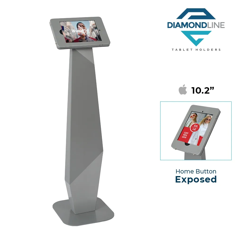 This iPad stand 10.2 inch is part of our Diamond Line range of premium products. These displays feature a robust design and stylish geometric pattern with glossy finish for an upscale look in any location at an affordable price. This display is able to hold Apple iPad 10.2”, which includes iPad 2019 (7th generation), 2020 (8th generation), and 2021 (9th generation). Your device can be placed in either landscape or portrait orientation depending on your needs. With the home button uncovered on this model, users are provided more access to your tablet to allow a wider range of uses. The front facing camera is also exposed to be used for facial ID or other interactive experiences.