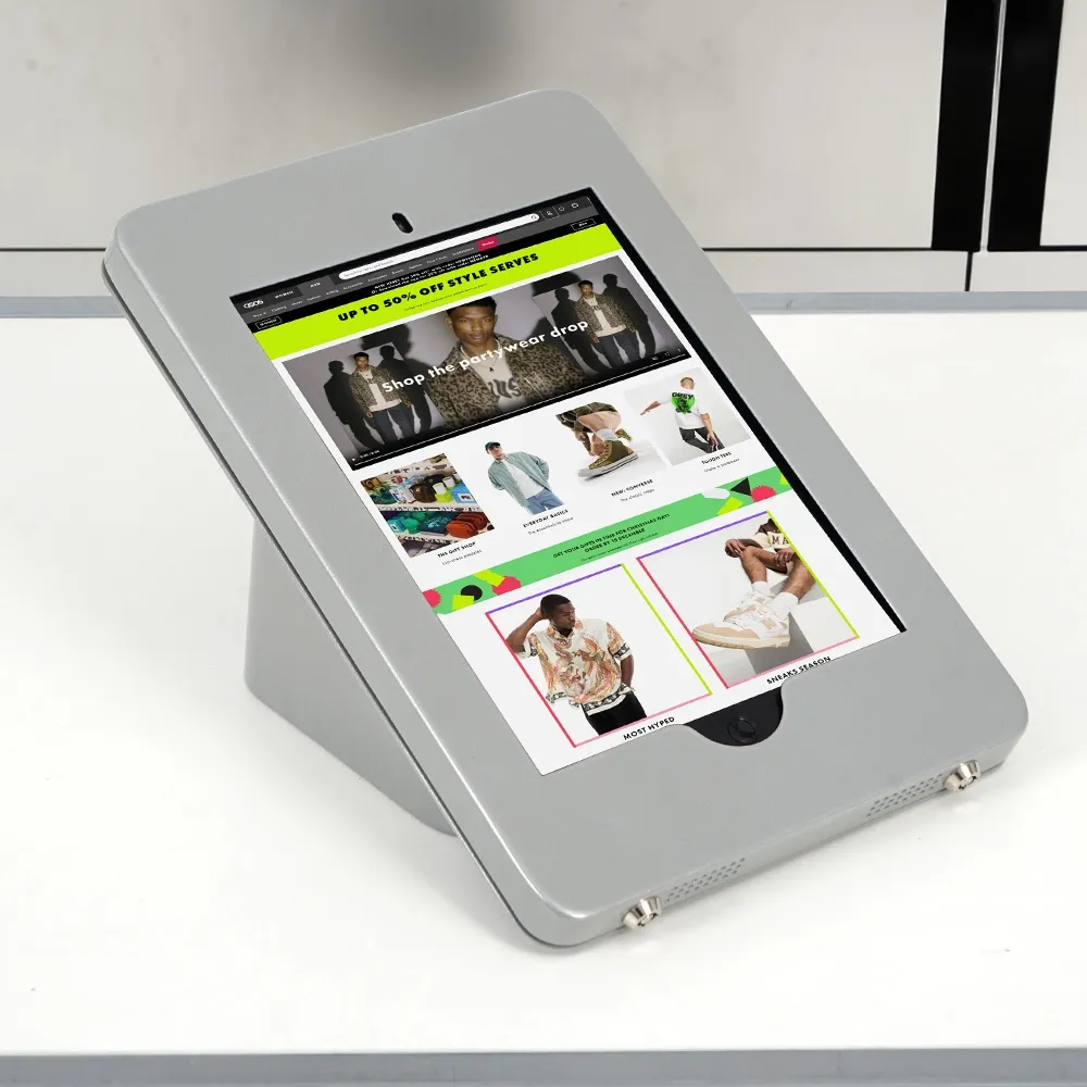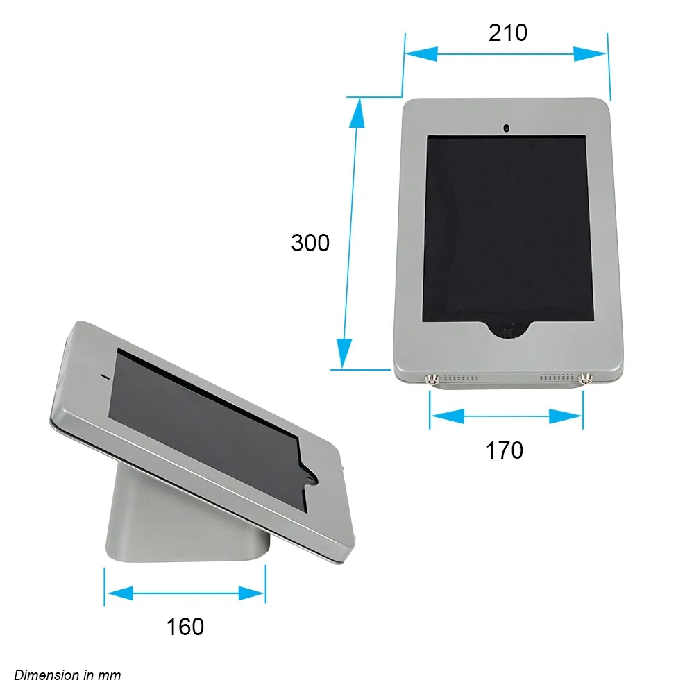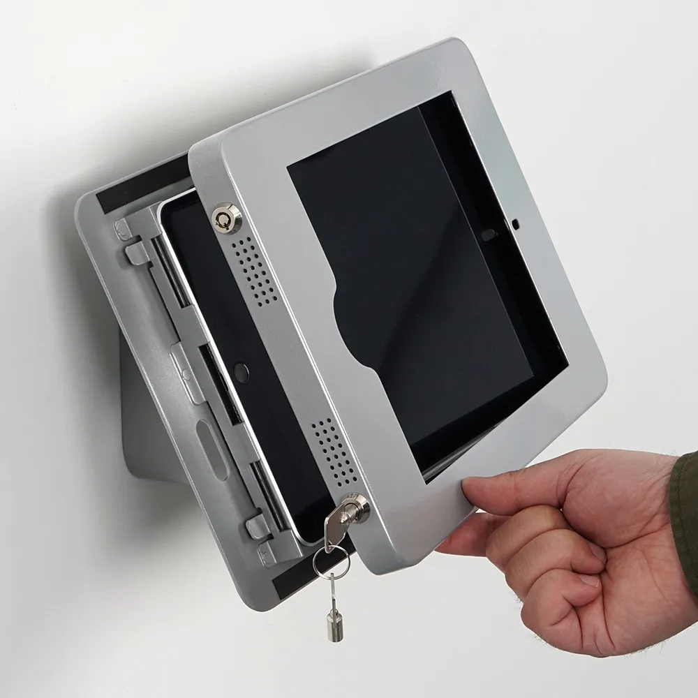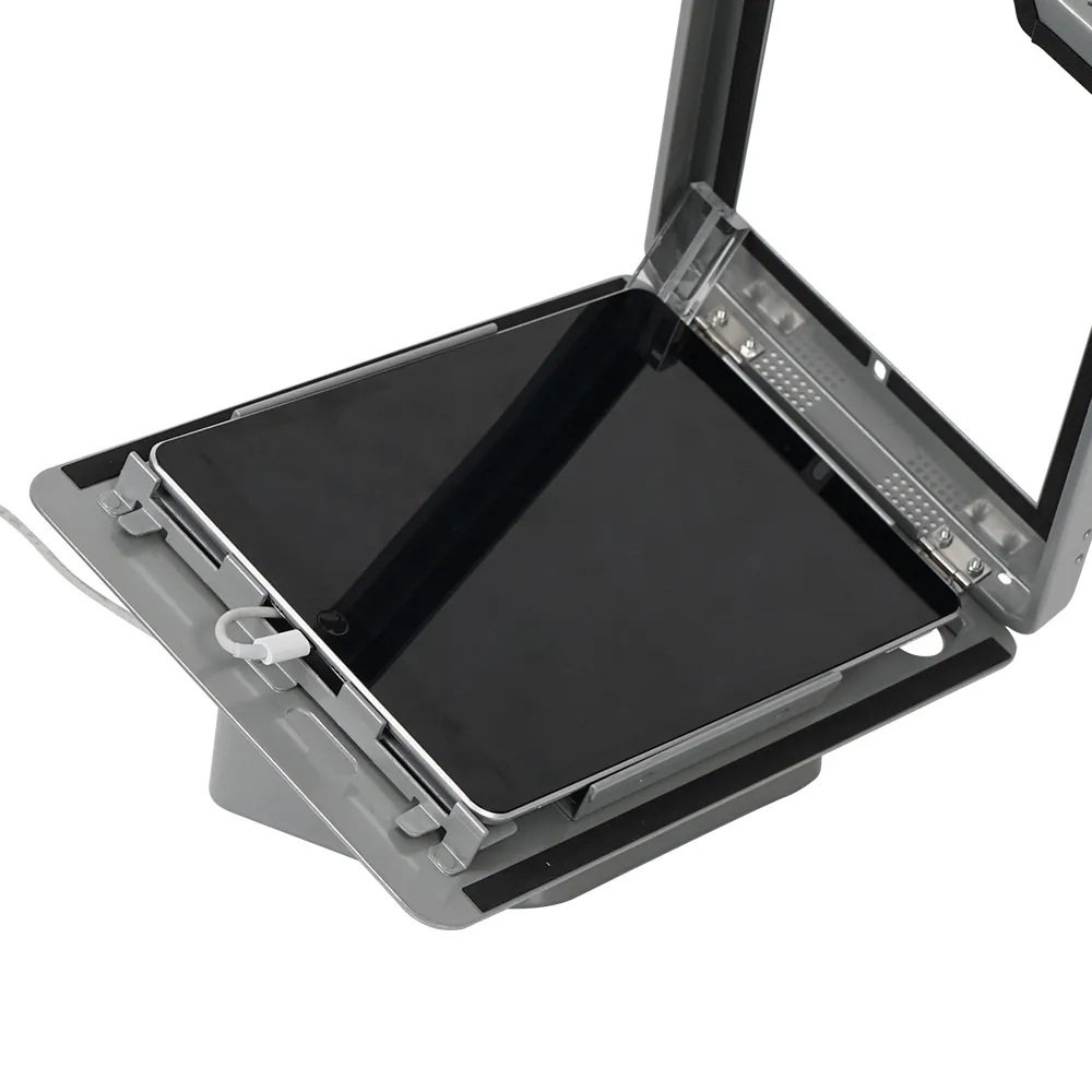 This locking tablet holder, iPad mount stand is a secure display designed for use in public areas whilst helping to deter theft. There are two locks on the bottom of the unit that allows access for employees using the included keys. There are also air holes located near these locks that allow for air flow as well as for speakers to be heard if in use. A Kensington lock slot on the rear of the display allows for additional security measures using a cable system, sold separately. This style of holder is great in retail stores, information centres, restaurants, museums, and more.