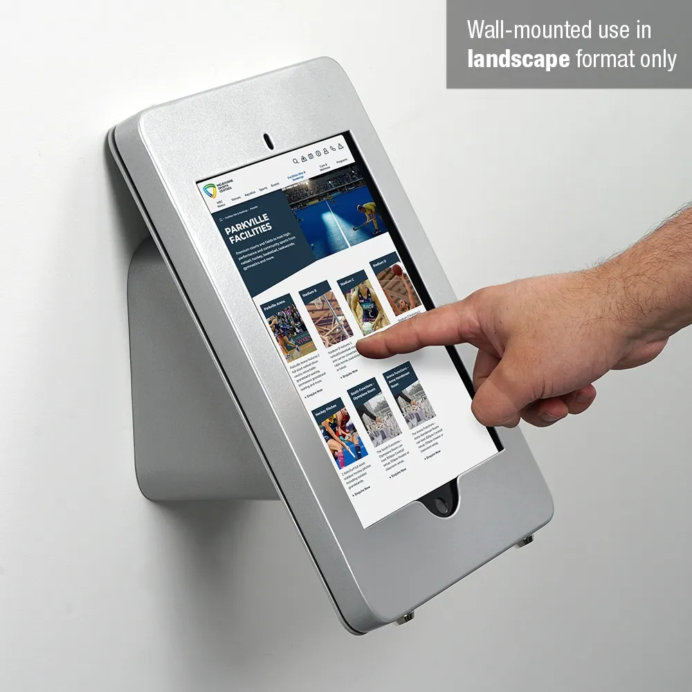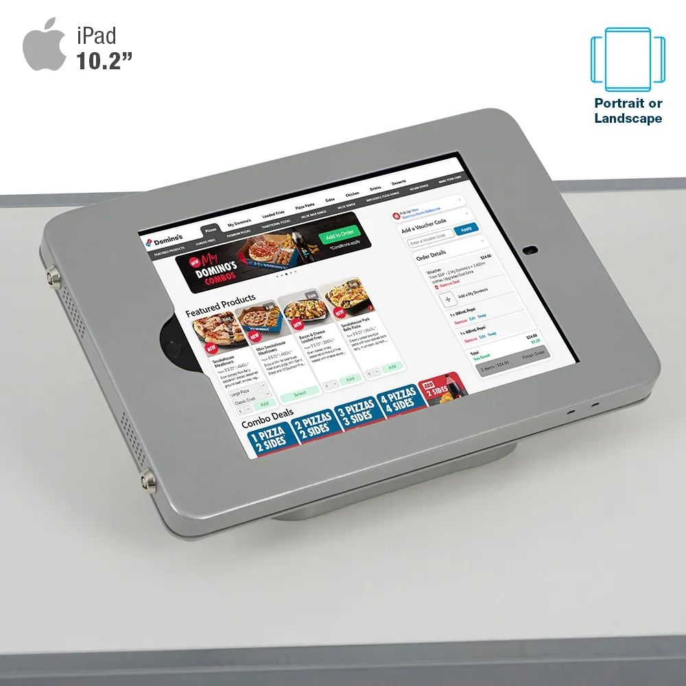 This iPad mount stand is designed for use with Apple iPads Apple iPad 10.2”, which includes iPad 2019 (7th generation), 2020 (8th generation), and 2021 (9th generation). This holder displays these devices in landscape or portrait orientation to offer the layout that will be bes suited for your needs. The holder is mounted onto a wall or counter-top at an angle to make it easier for users to enter their information. As an extra precaution, the home button is covered on this model to prevent full access to the device and keep users on the pre-loaded apps.