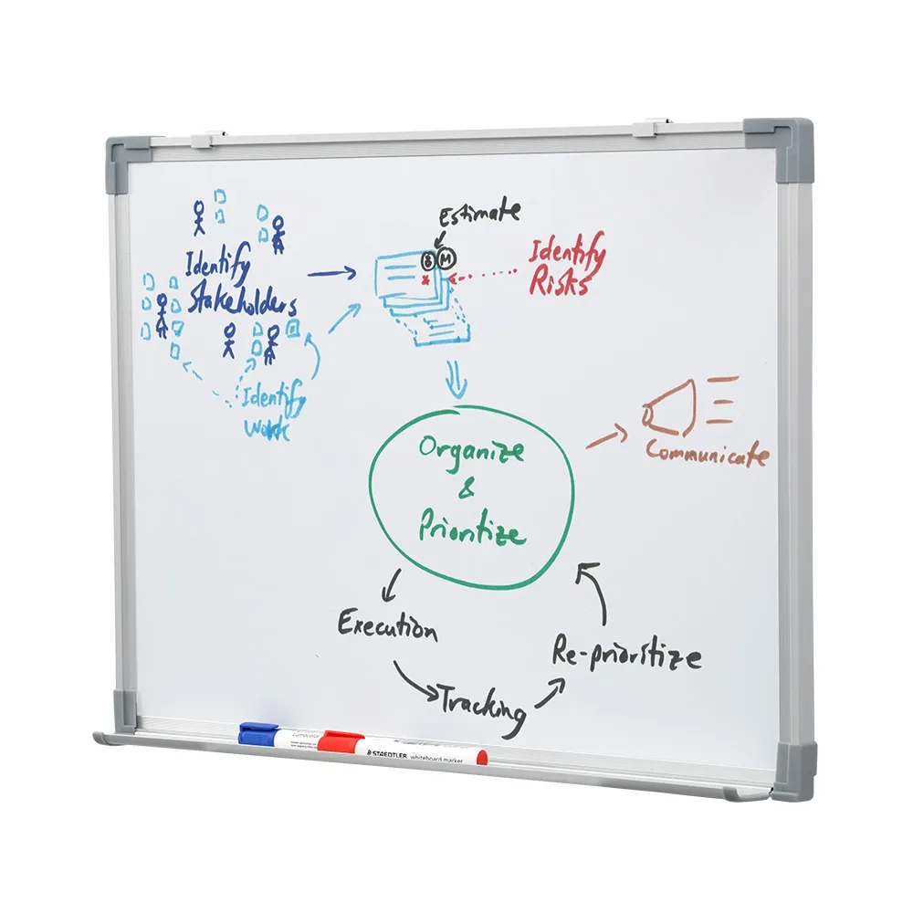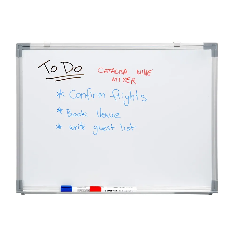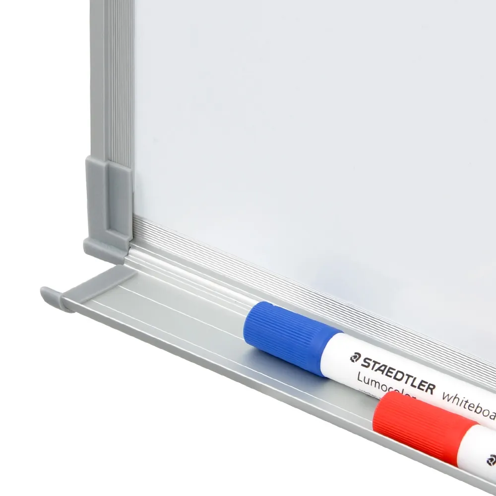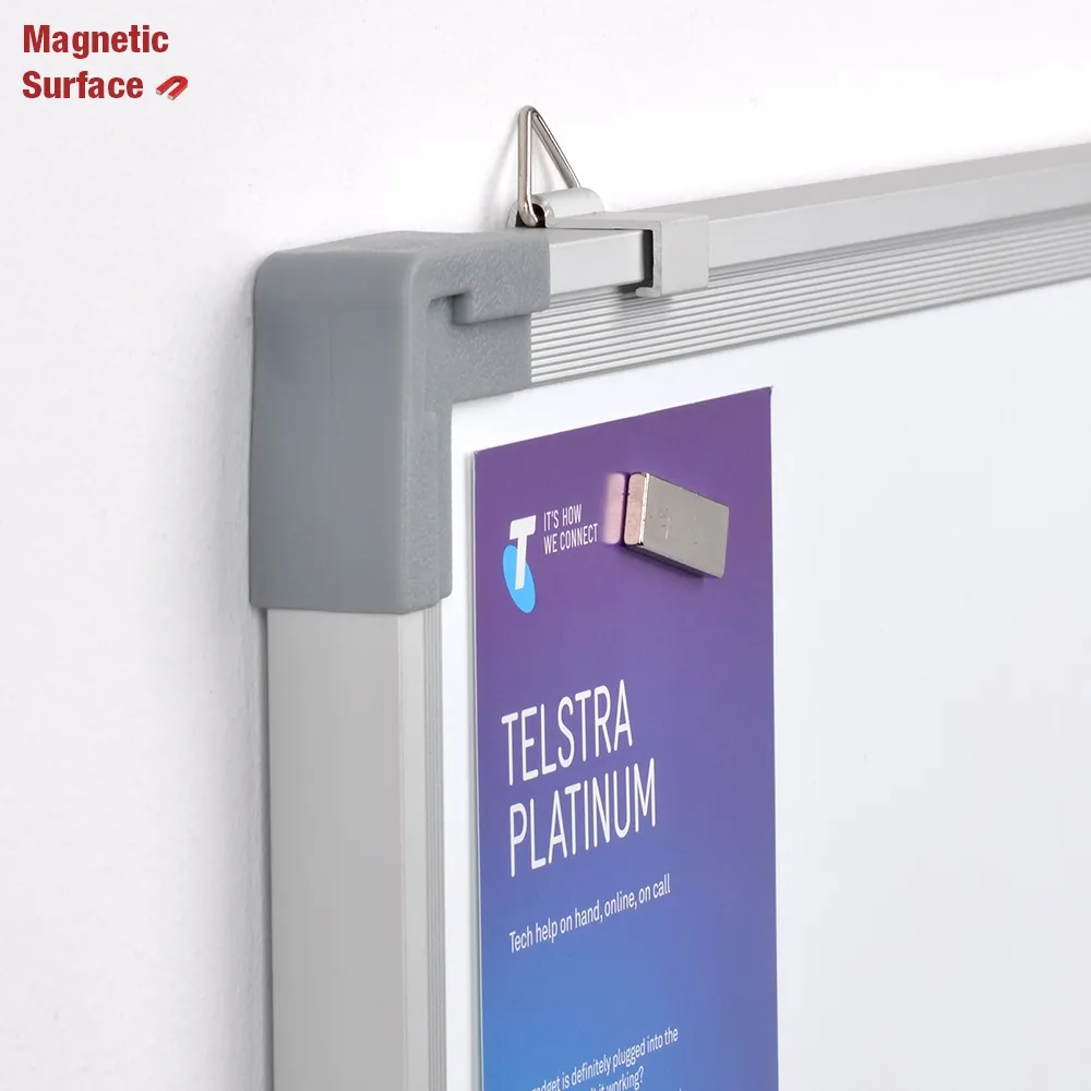 This dry erase board or small whiteboard features an aluminium frame with moulded plastic safety corners, integrated marker tray and sliding eyelets that allow some flexibility when mounting your white board to the wall.