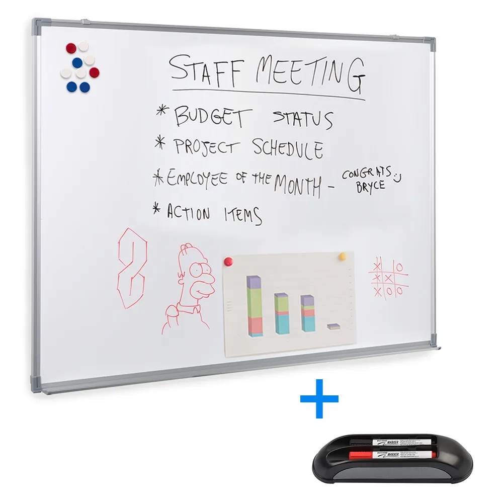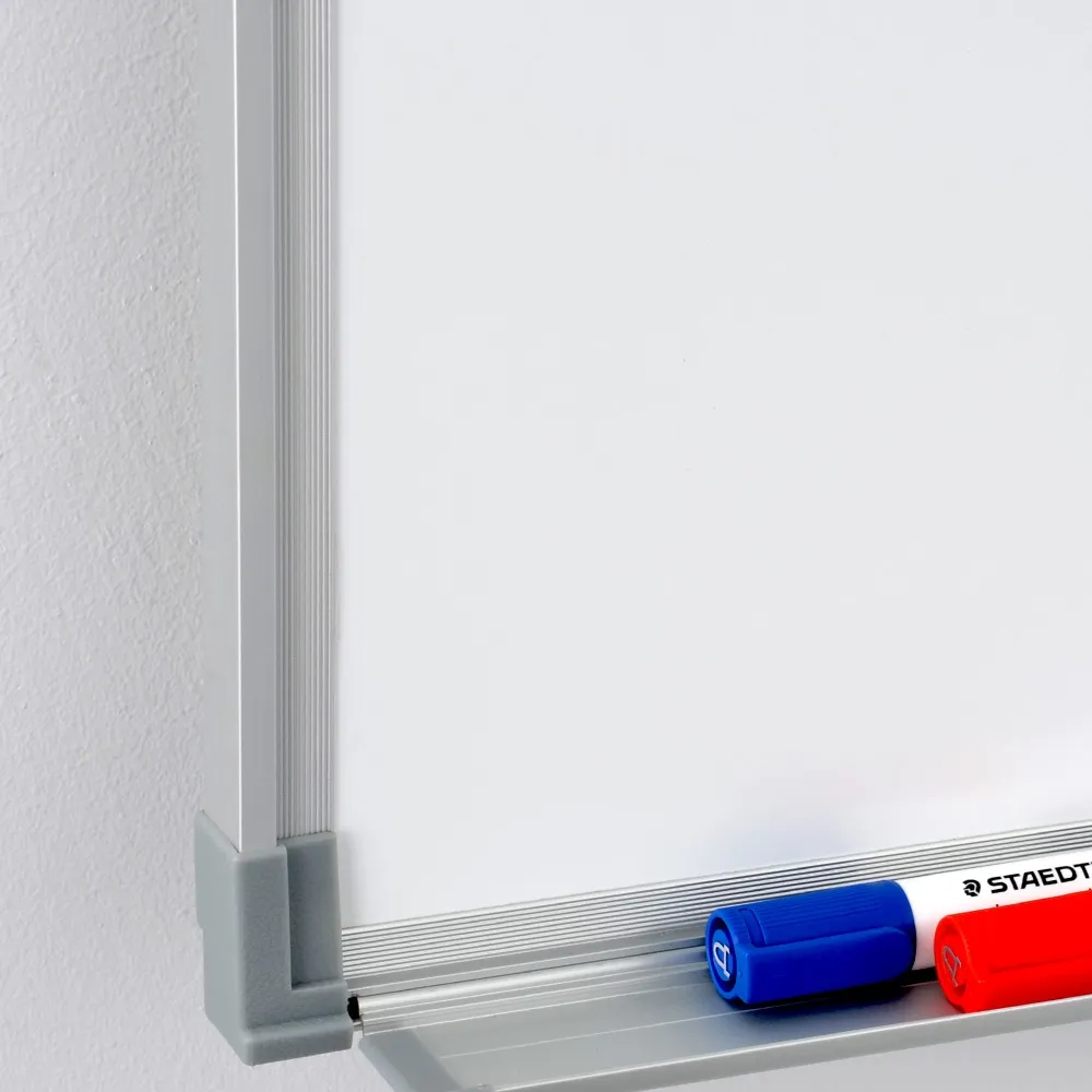 This magnetic white board is economically priced but packed with commercial grade materials and features to provide a great return on investment! The 1200 x 900mm size offers ample space for presenters or teachers to use at conference centres, schools, offices, locker rooms, community centres, and more. The board features a 70% to 80% gloss acrylic surface with a steel back, offering an easy to clean display that is accepting of magnets. There is a tray at the bottom of the whiteboard to make markers and erasers easily accessible, with a raised lip to prevent items from sliding off.
