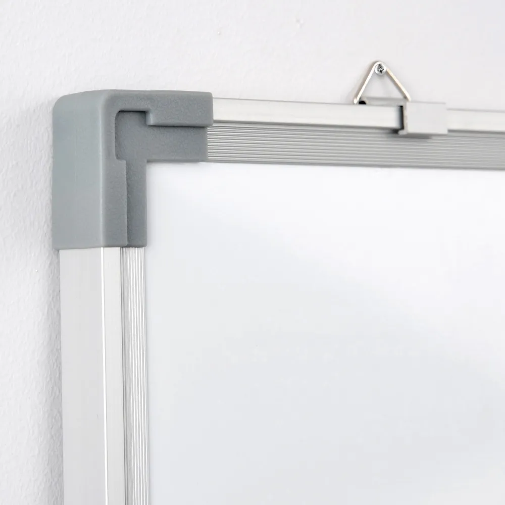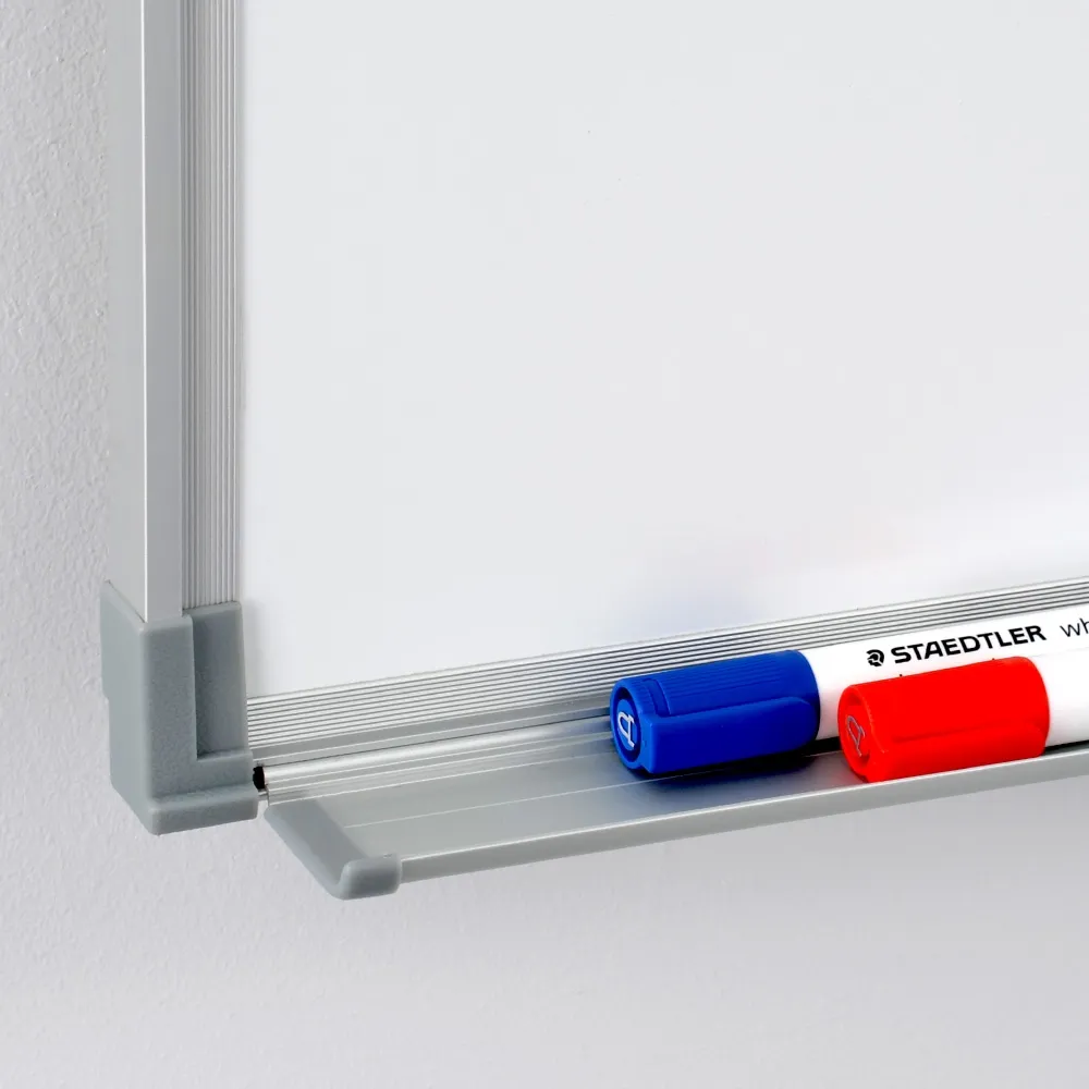 • Aluminium frame around steel whiteboard has rounded plastic corners for safety