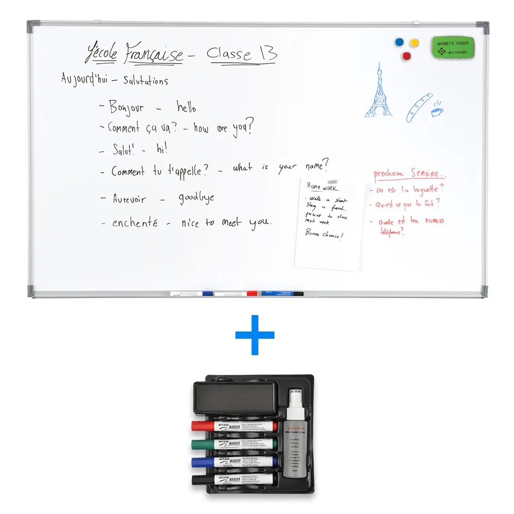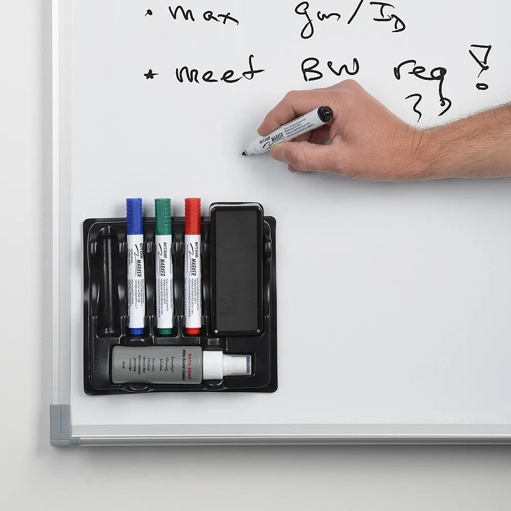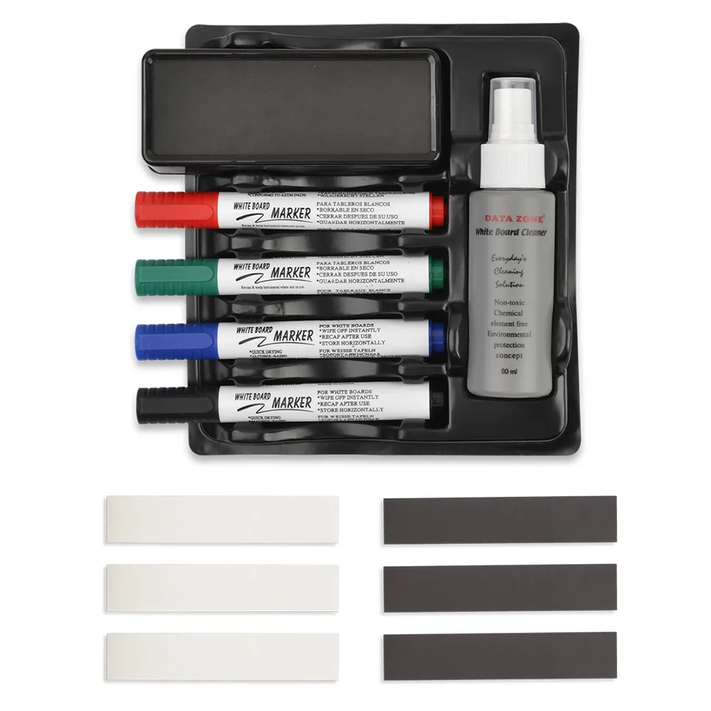 • Marker kit is included with (4) dry erase marker colours, cleaning solution, & eraser