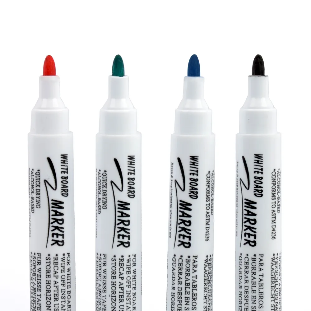 These 4 dry erase markers have multiple colours to choose from, making it easy to create readable inscriptions on boards that are easily visible! The pens are designed for use with non-porous surfaces, including white boards. Each pen has alcohol-based ink that provides vivid colours, with blue, black, green, & red markers included. The low-odor pens are perfectly safe for use in offices, schools, and even at home! The fast drying ink is quick drying and easy to erase using only a soft eraser or cloth, though if left on for long periods of time a simple cleaning solution might be needed.