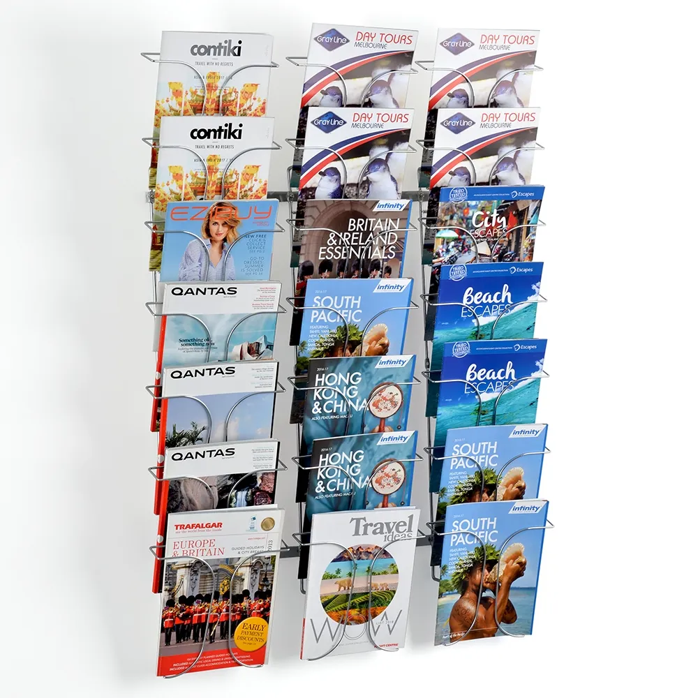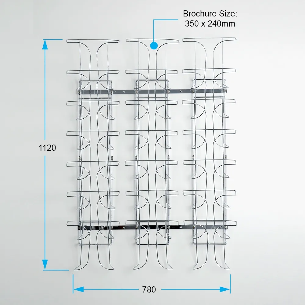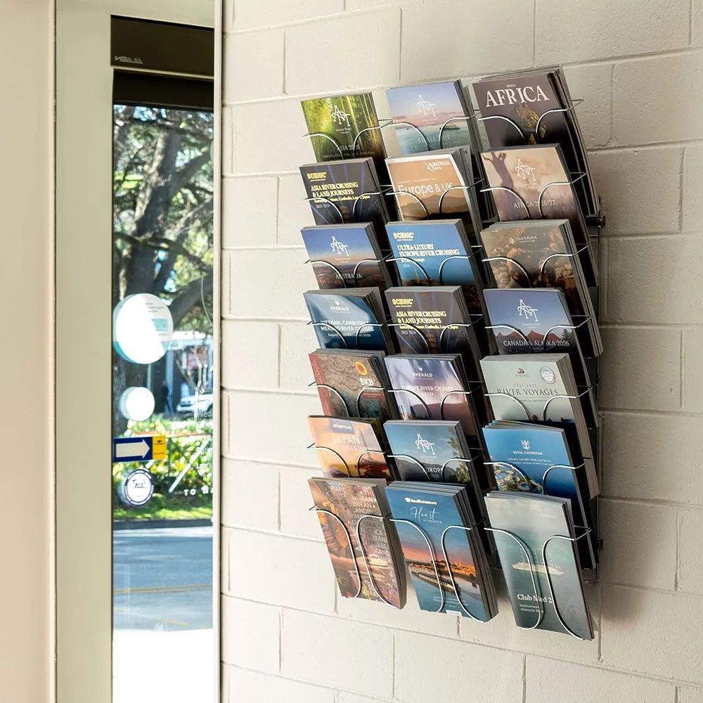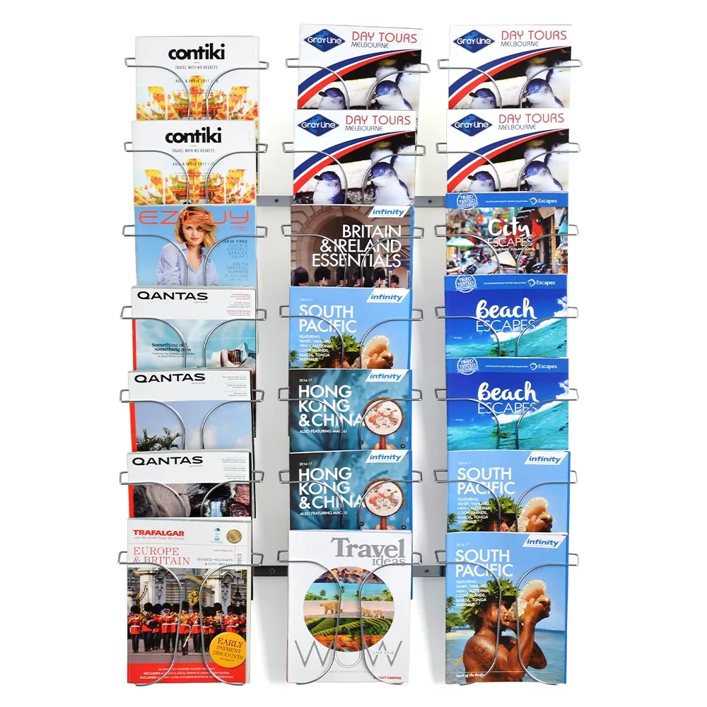 The brochure holder, magazine rack has three rows of (7) pockets for holding the literature. Each pocket is slightly angled to make it easier to both read and grab the displayed broc hures. This magazine rack, like a wire catalogue holder, is designed to hold A4 sized materials, but is able to display any items that are 240mm in width.