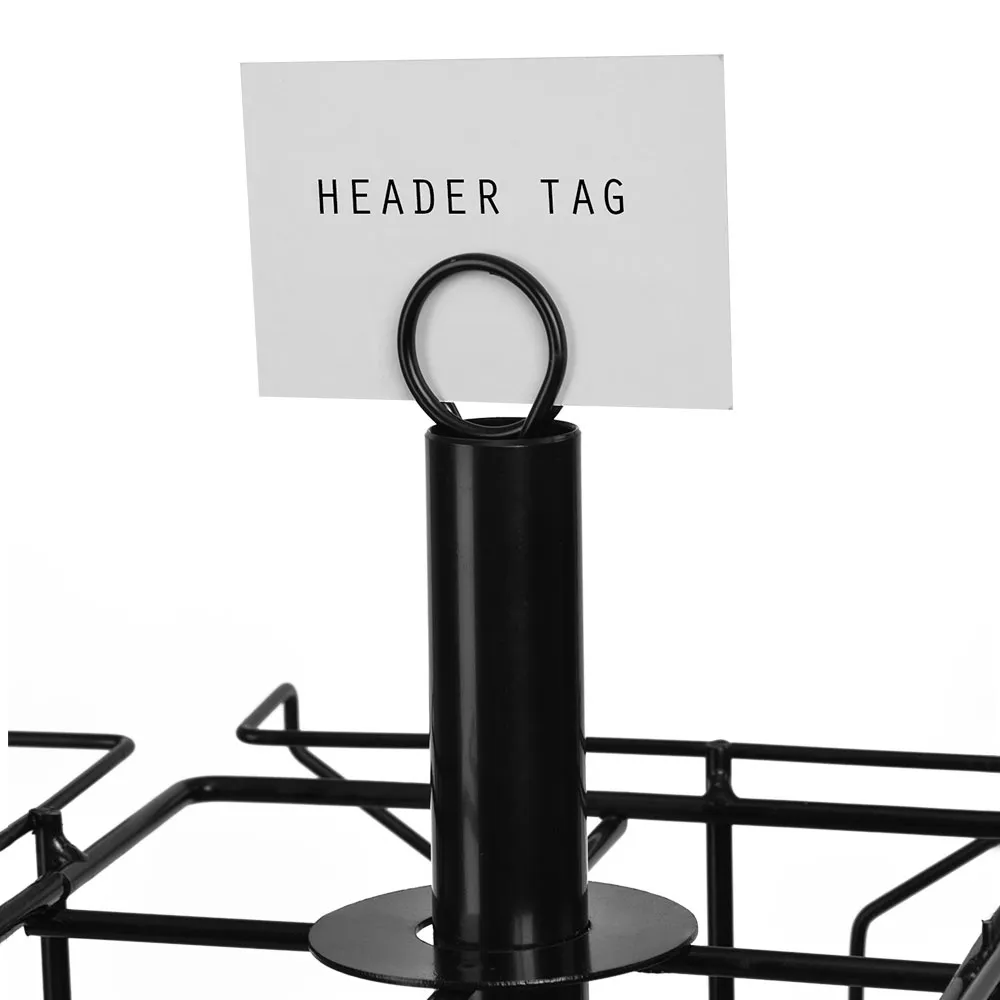 This countertop card spinner, tabletop brochure display, has 115 x 140 x 35mm pockets designed to hold leaflets, greeting cards, brochures, and more. The deep pockets let you fill the stand with stock without having to constantly refill the display. The stand uses a waterfall style tier to show most of each item on display to allow your customers to peruse with ease. The stand is 700mm tall to fit on a countertop without full obstructing view. The top of the rack has a holder for signage up to 1mm thick, ideal for promoting what is in the rack or displaying the sale price of merchandise.