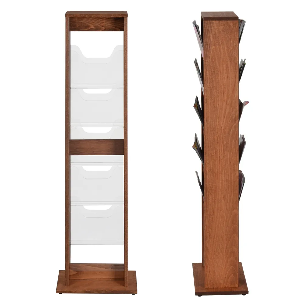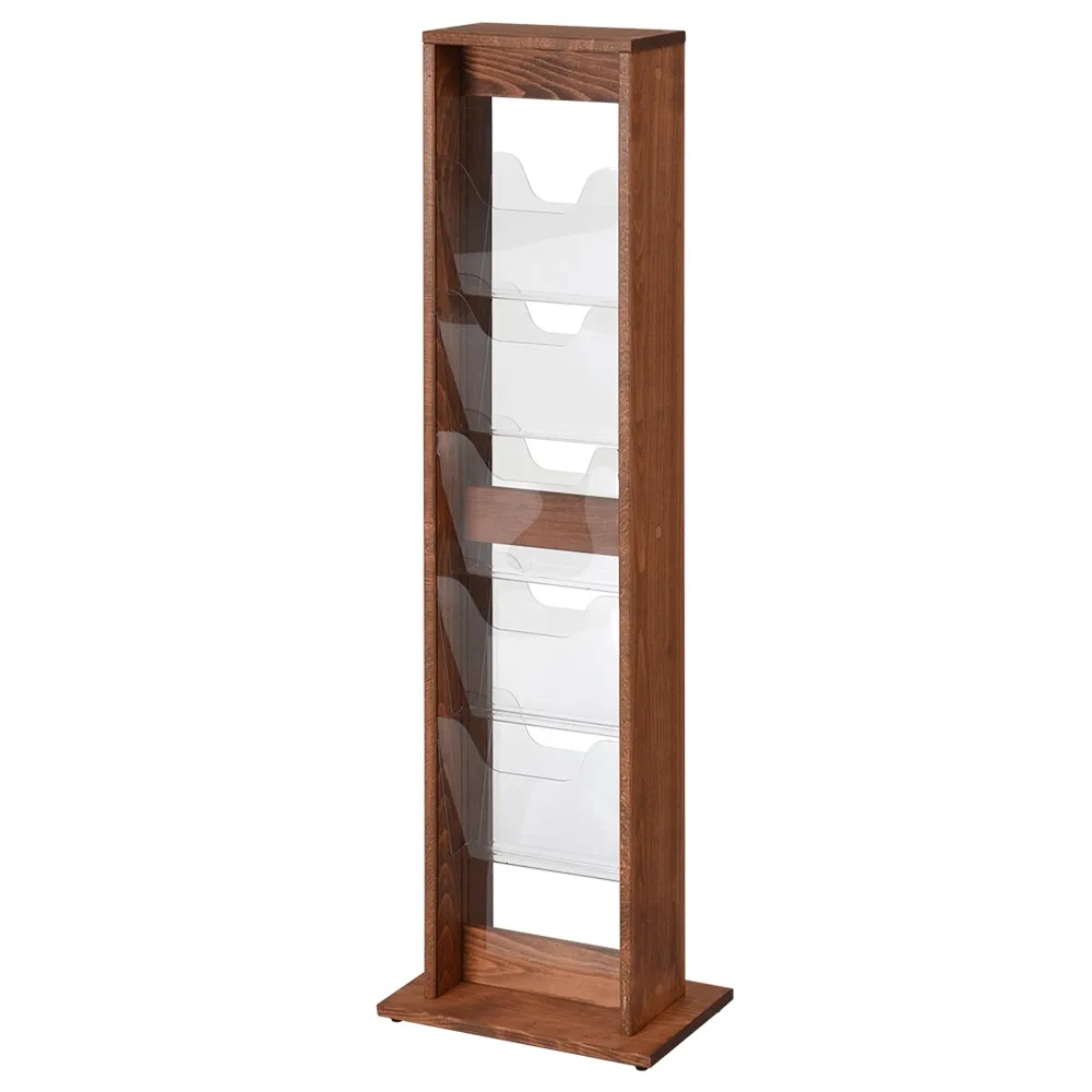 This free standing wood magazine rack features a dual-sided build that maximises visibility in whatever location it is placed! This wooden brochure holder has (5) pockets on each side, offering 10 total pockets for holding information flyers, travel pamphlets, product information, magazines, and more. The pockets are each made of 5mm thick clear acrylic that provide an almost full cover view of on display information, with a cut-out in the top making it easier to take out a brochure. The pockets are angled as well for not only a more aesthetically pleasing look, but also assisting in easy removal.