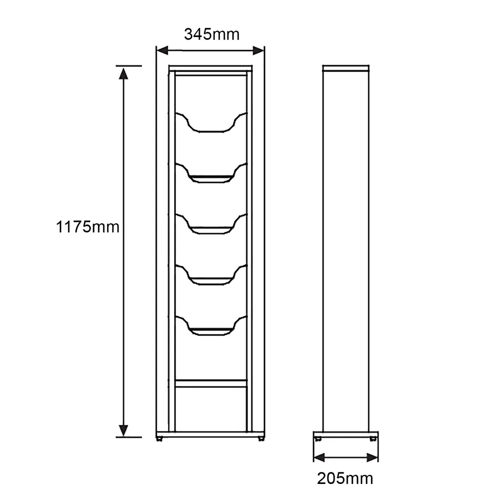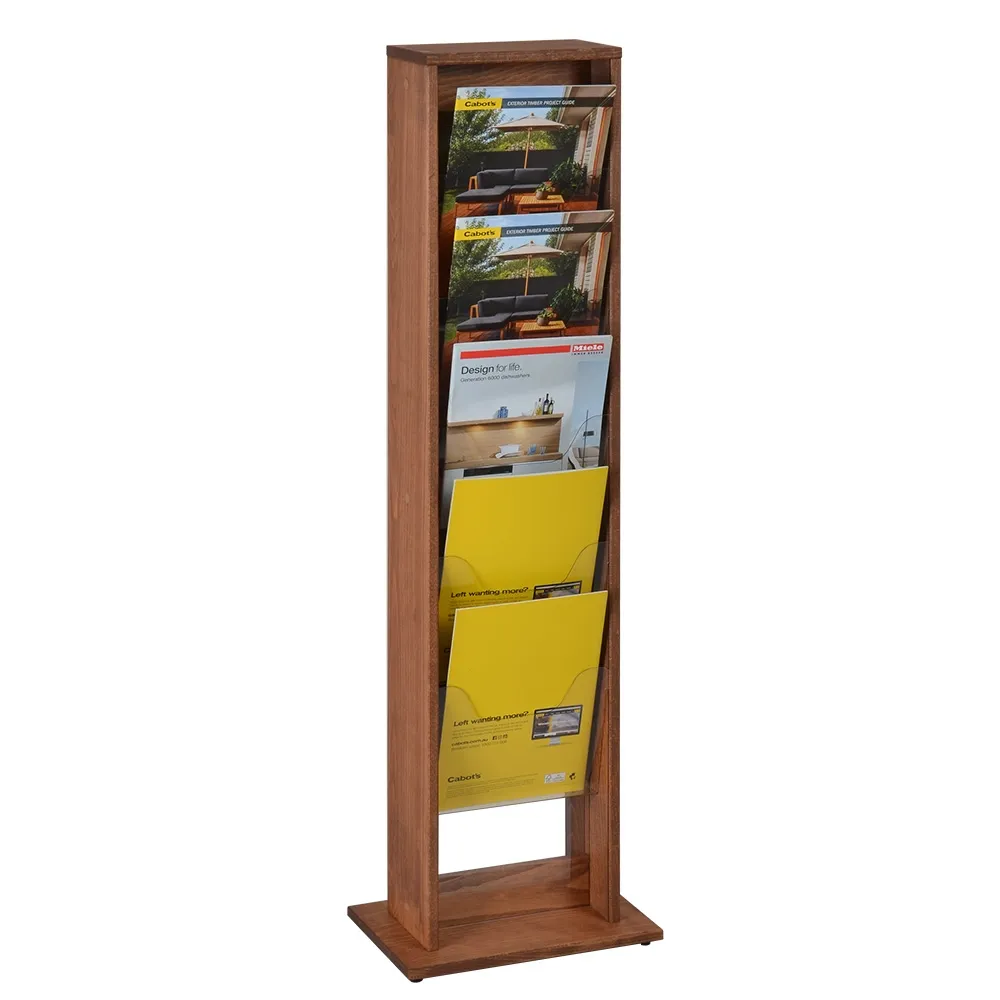 This free standing wood magazine, like a wide array of our brochure display holders, is designed to hold up to A4 (210 x 297mm) standard sized catalogues that are in portrait format. The fixture is 1175mm tall to work within the confines of any retail store, exhibition booth, information centres, museum, hotel, news agent, or waiting room without intruding. The base of the unit is only 345 x 205mm as well to take up less space whilst still offering a sturdy display. Rubber feet on the bottom help to prevent floor damage and keep the floor standing literature display in place.