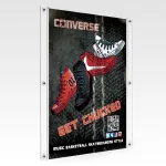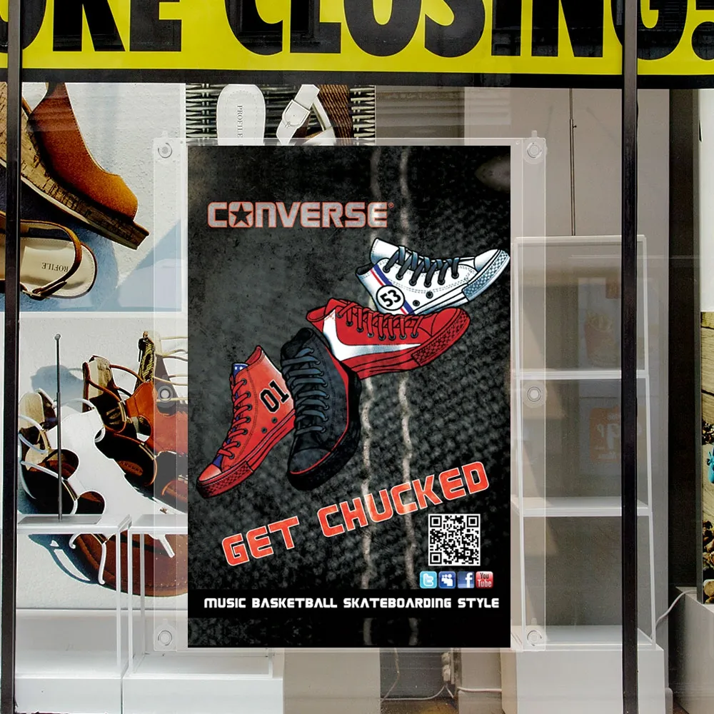 Poster frames, acrylic displays, and other window signs use 3mm clear acrylic to create the display. This strong material makes reading your posters very easy! The window signs used a folded acrylic design for quick graphic change-outs, requiring less than 60 seconds.