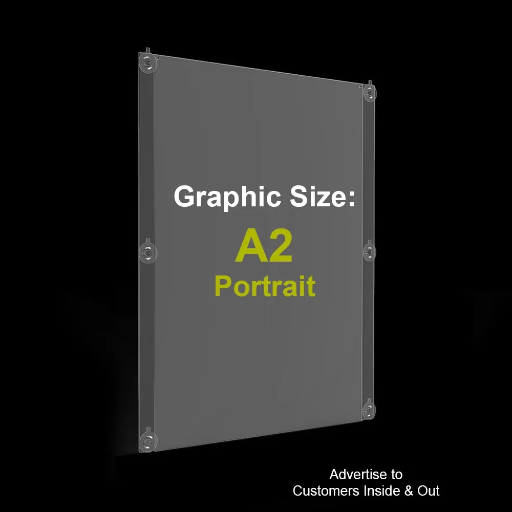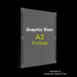 - 3mm Acrylic frame holds A2 graphic in portrait format on both sides