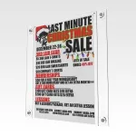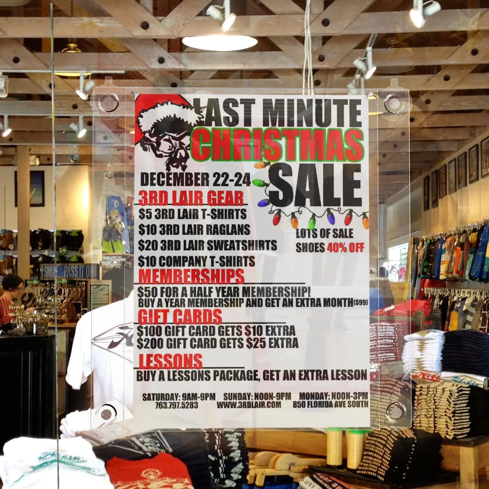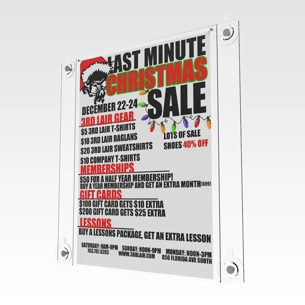 The hanging frame, also known as acrylic window hangers and suction cup displays, has magnets embedded in the acrylic frame. These help to prevent the sign from opening while on display, as well as keep your graphics in place! Switching out posters takes less than 60 seconds using due to the folded acrylic design!