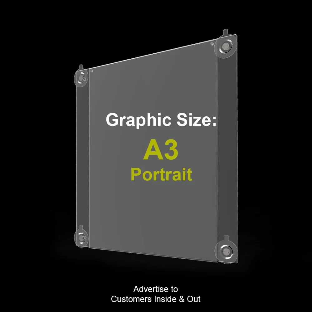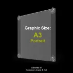 - 3mm Acrylic frame holds A3 posters in portrait orientation on both sides