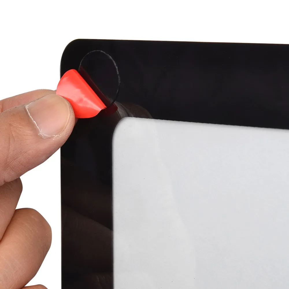 Looking to hang posters with a self adhesive sign holder? This wall mount sign frame attaches to your wall or window without any tools necessary! There are (10) clear adhesive dots on one side of the frame that securely stick to most non-porous surfaces and aren't visible when adhered. These dots are designed for single use, and will keep the frame firmly against the surface once applied.