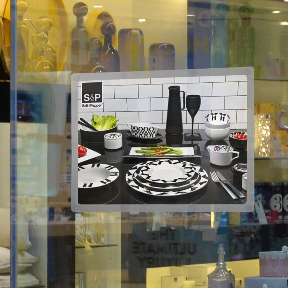 The glass mount sign holder is a dual-sided display, helping you to maximise space and promote to visitors as they come and go. An A2 (420 x 594mm) poster in landscape or portrait format can be displayed inside the poster pocket reaching out in two directions. Like plastic clip frames, changing out posters requires no tools as magnetic strips hold the pocket together. Simply lift out the poster pocket, replace the posters, and let it reattach!
