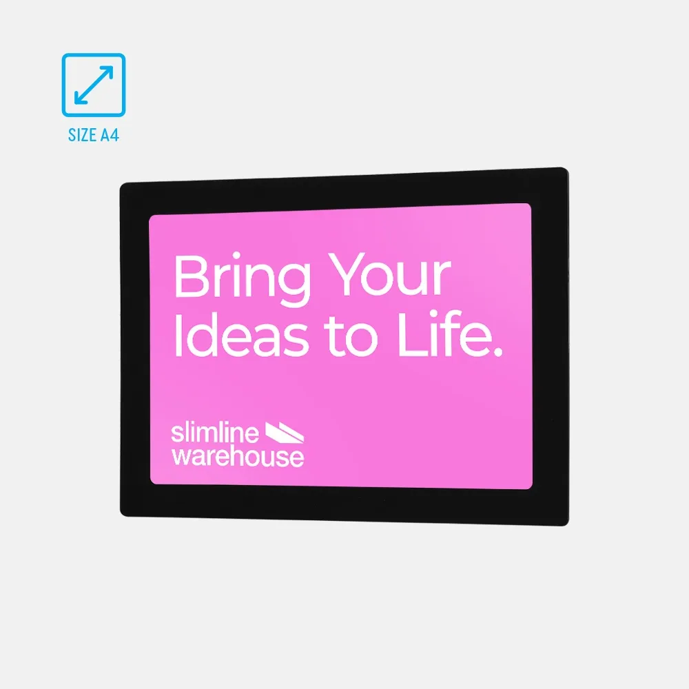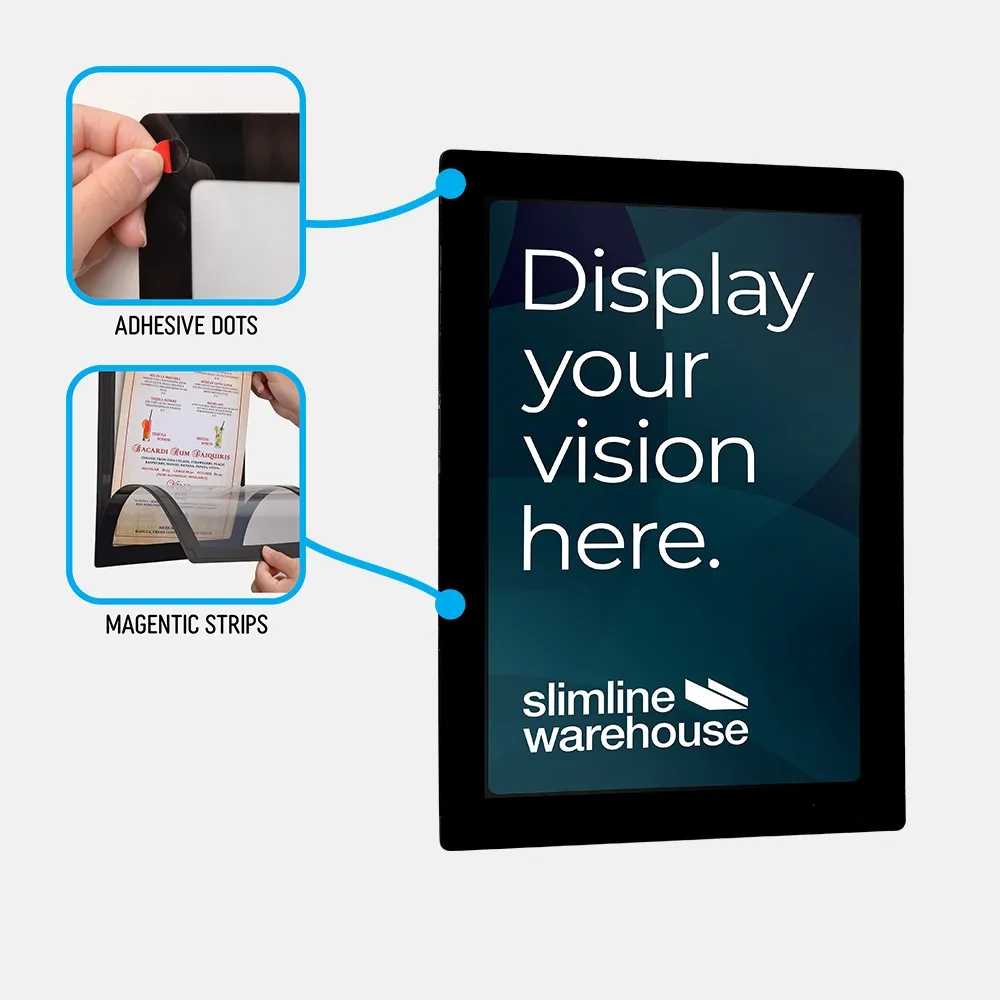 The glass mount sign holder features interior magnets to hold the sides of the frame together. This makes poster changes fast, with the sides simply being lifted up, posters switched, and then let the sides reattach. Order this display by 3pm EST to receive same day despatch to Sydney, Adelaide, Melbourne, Brisbane, Perth, and anywhere else Australia-wide!
