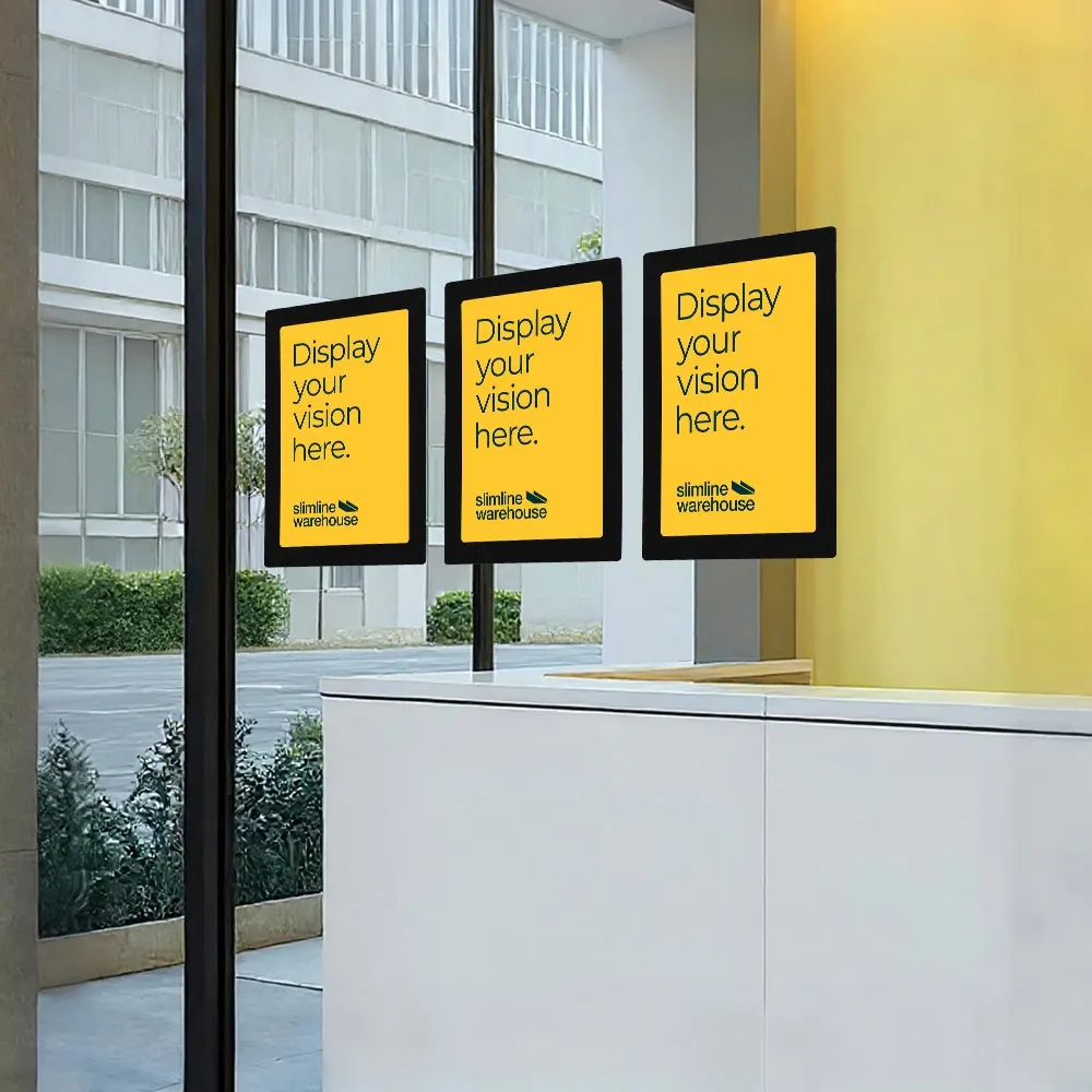 This stick on signs for glass doors displays an A4 (210 x 297mm) in portrait or landscape orientation,making it easy to create promotional materials that best suit your layout and design. The window display can be used as a single or dual sided display based on where you install it. This poster frame is perfect for use on windows or glass doors to maximise your reach to potential customers!