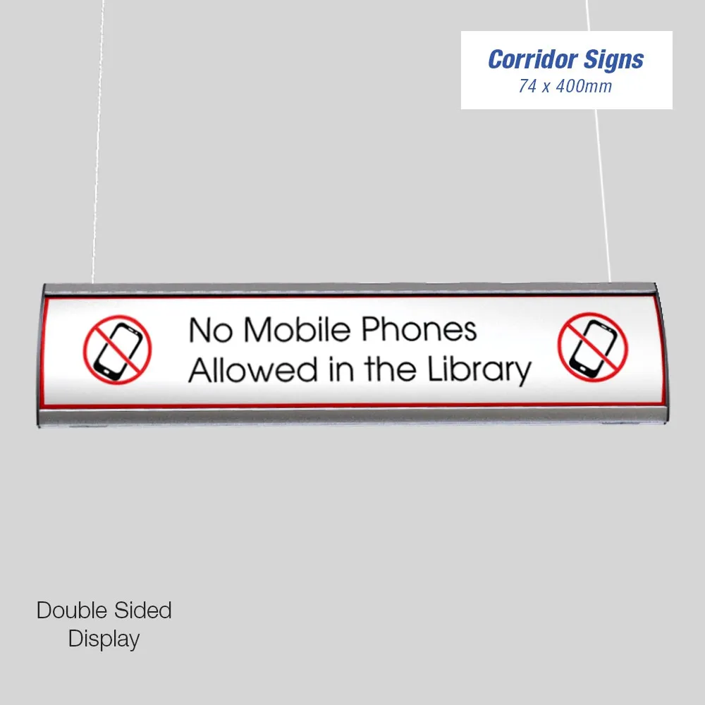 The wayfinding signage has (2) graphic displays that hold 74 x 400mm graphics. These signs each include a protective lens that keeps graphics from getting damaged during display by preventing grime or dust from damaging them. This makes it easy to maintain a professional appearance. This lens is easily removed for graphic changes using the included suction cup tool.