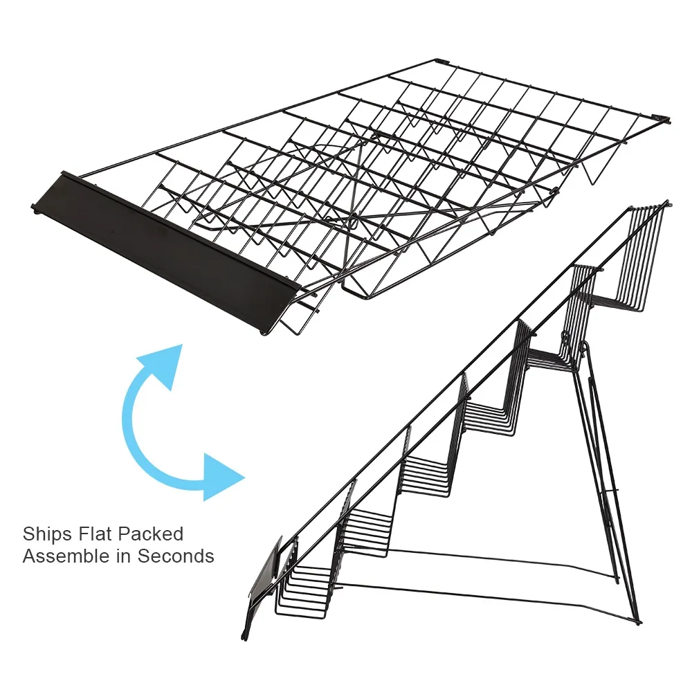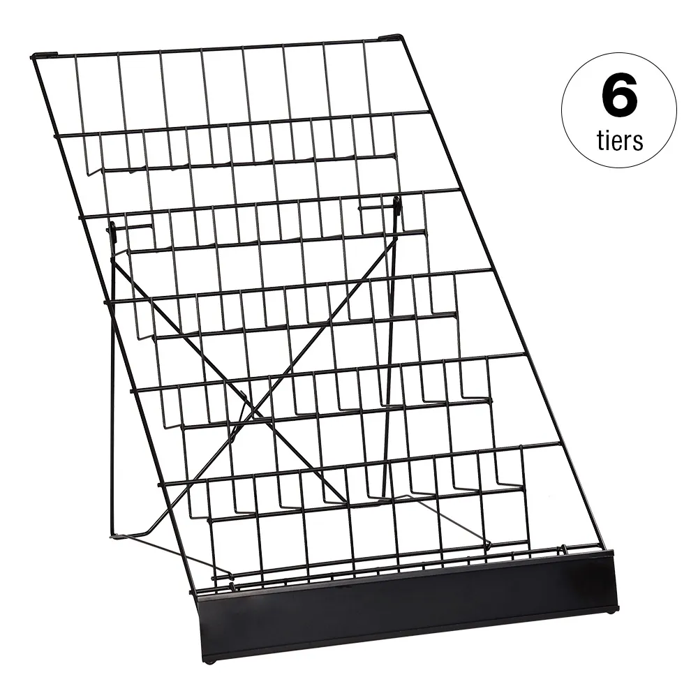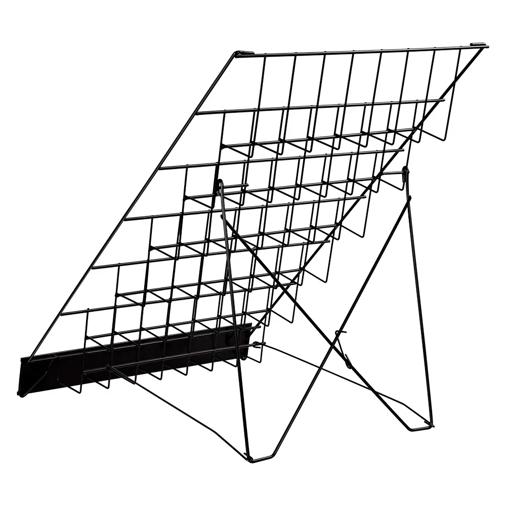 The desktop literature organizer, like a wire brochure display, is made of powder coated black steel, ensuring long-lasting use in any area. The lightweight display is only 2.1kg, and ships flat to keep shipping costs lower. Once assembled, the display is 570 x 460 x 580mm, perfect for placement on a table or countertop. The fold out legs make set-up simple with no additional tools required.