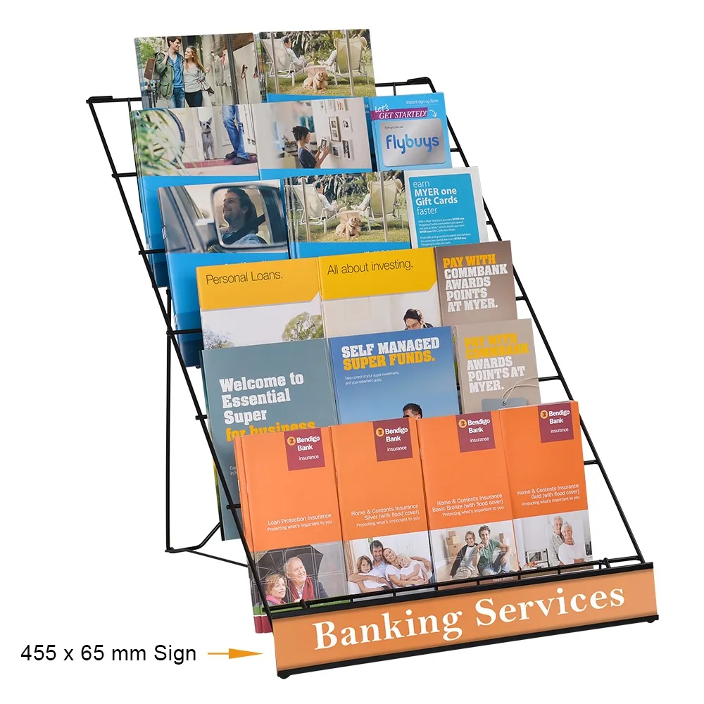The metal brochure racks have a pocket depth of 60mm, making it easy to stock the display up without having to constantly check if refilling is necessary. There is a 65 x 455mm sign channel to display a graphic to help customers understand what the display is being used for. The channel accepts substrates up to 2mm in thickness. Order today by 3pm EST to receive same day despatch to anywhere in Australia when in stock with this and many of our other products, only from Slimline Warehouse!