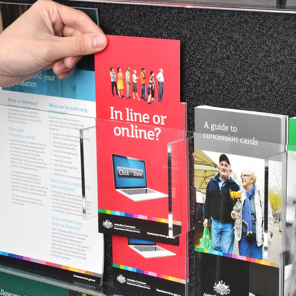Similar brochure displays on the market overlap the documents on display, making it difficult to browse the selection on offer. These wall brochure stands do not overlap the brochures, but present the full face of the brochure to the viewer through the clear plastic pocket. This results in a thinner display and allows patrons to easily browse all the material on offer.