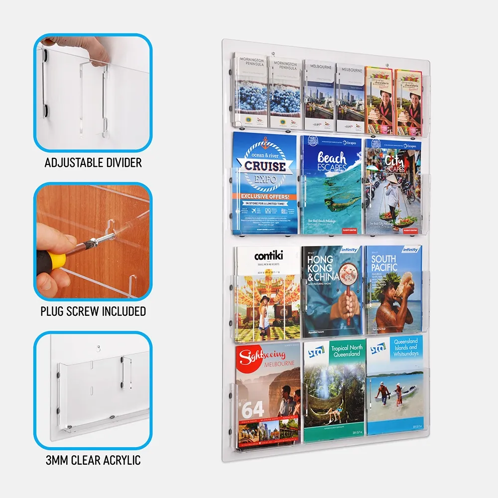 By using one of our acrylic wall mounted brochure displays, all your marketing material and information sheets are kept organised, your counters will be kept free from clutter and your floor space can be used to display more product.