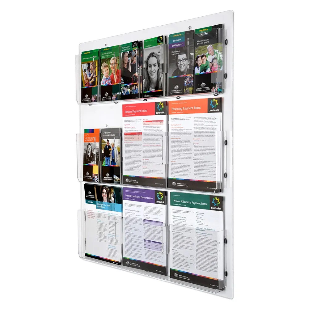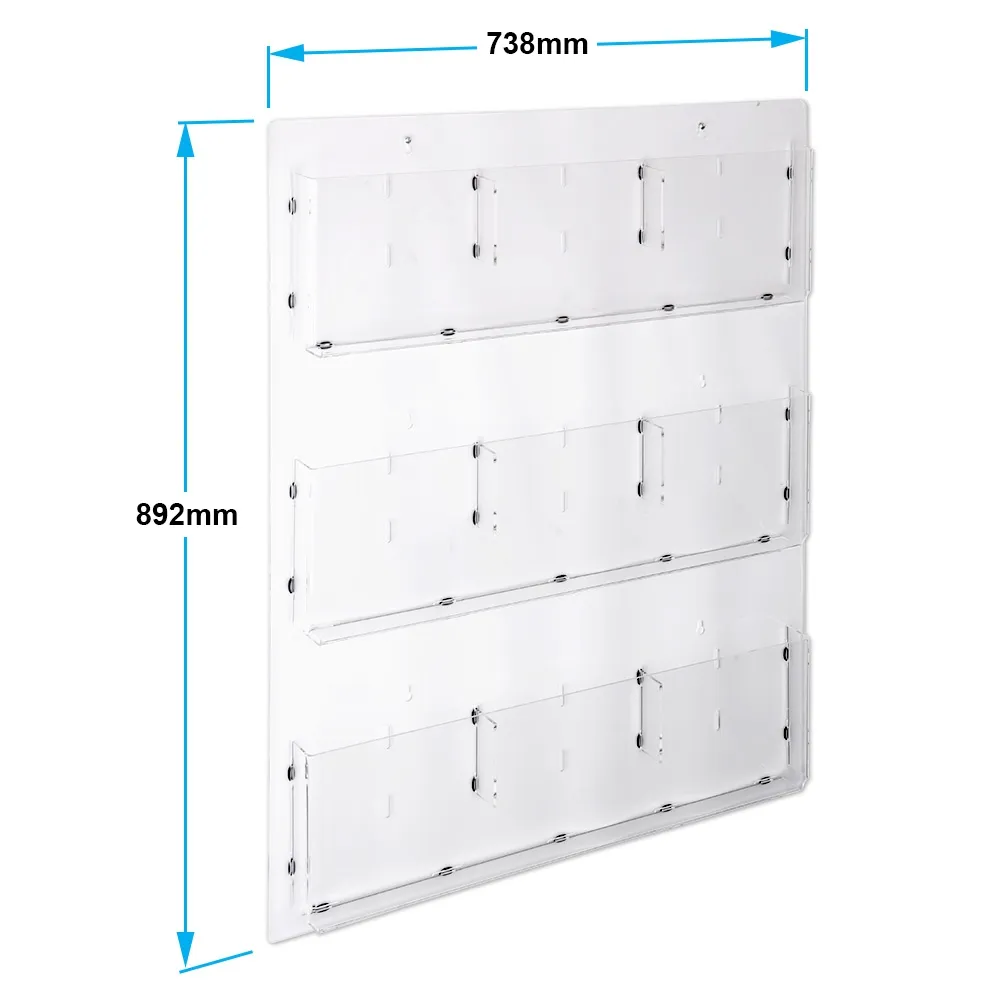 These wall mounted brochure holders are constructed to display 9 x A4 size portrait flyers or 18 x DL brochures. You can simply manipulate the brochure holder to the configuration you require by snapping in the supplied clear acrylic dividers to the