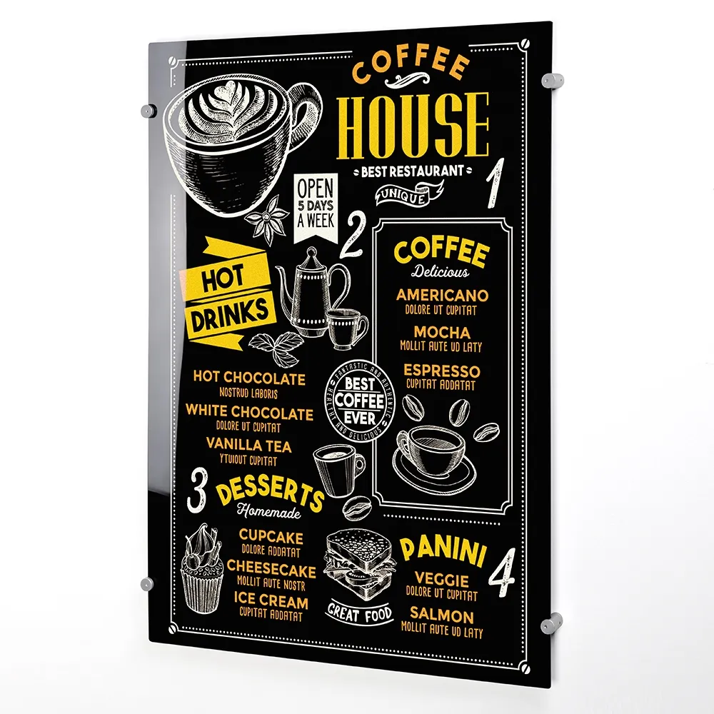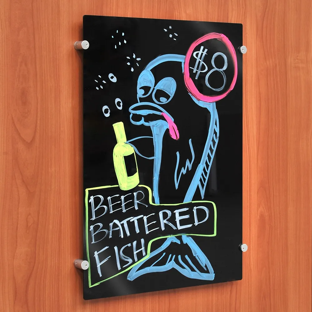 This black acrylic can be used with liquid chalk markers. These pens write in vivid colour that are easily noticed and read by customers! The black acrylic, like a menu display or black plexiglass board, uses edge-grip stand offs to hold the plexiglass in place.